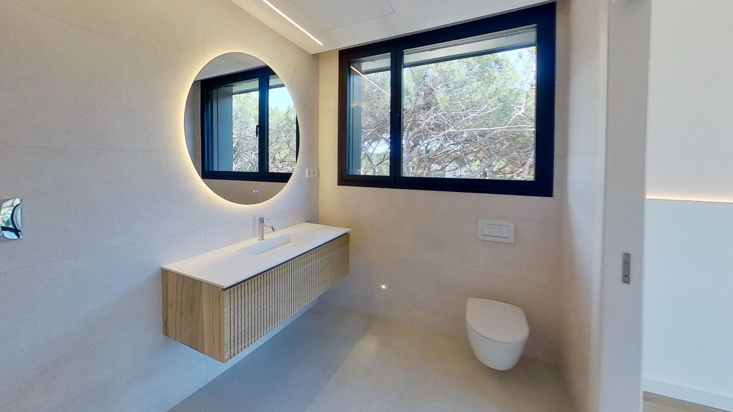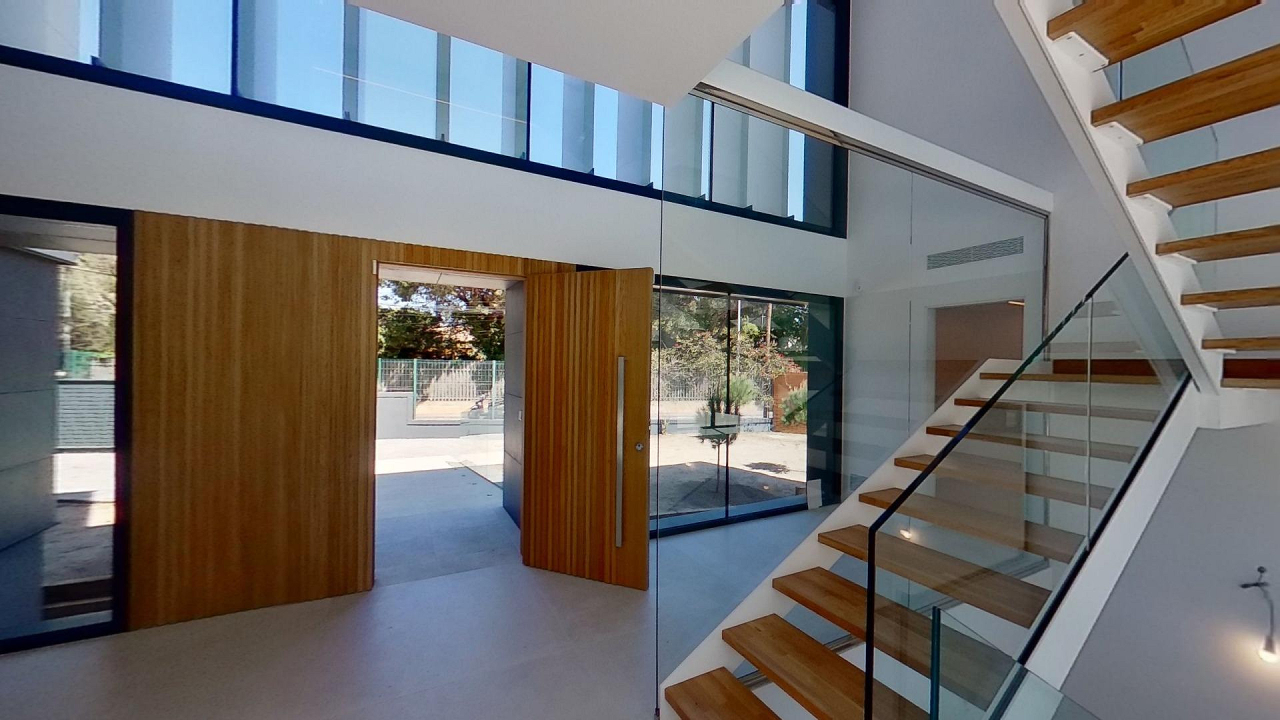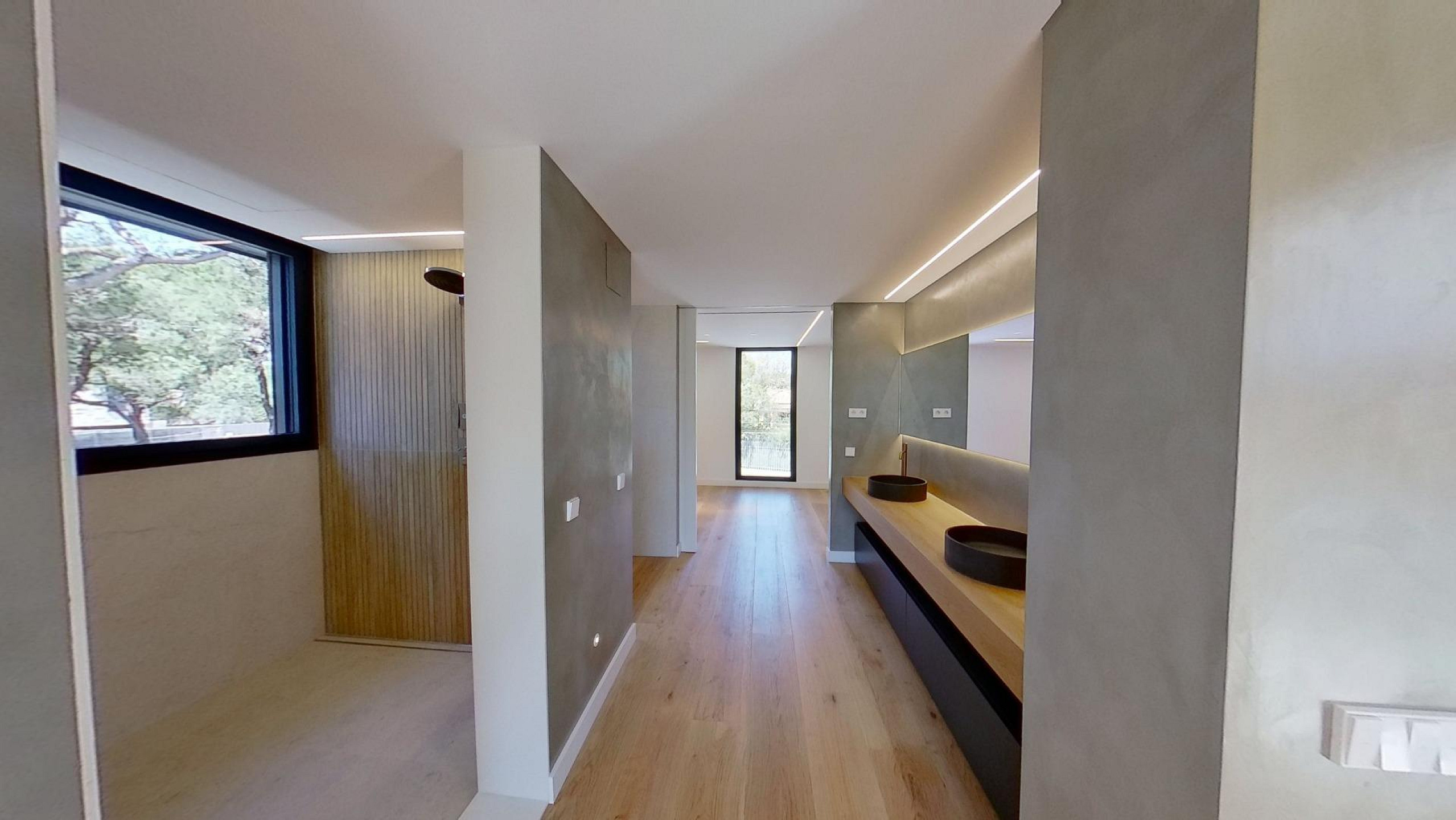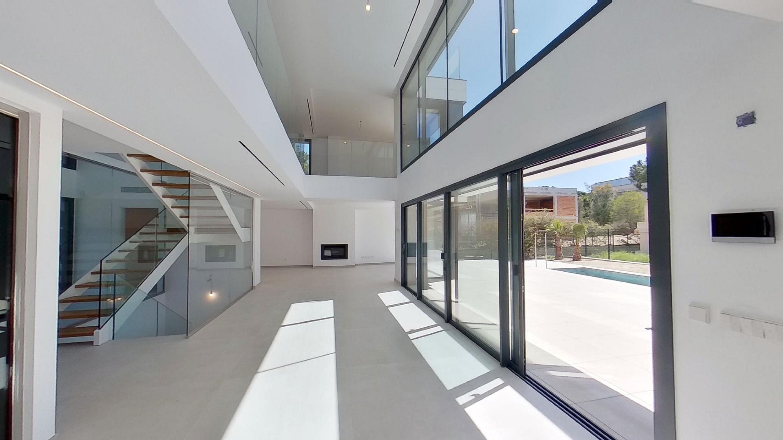 Дом оснащён передовыми технологиями и системами энергоэффективности: аэротермальная система с тёплыми полами, централизованное кондиционирование с регулировкой по зонам, солнечные панели, автоматические жалюзи и современная система «умный дом», управляемая с планшета.