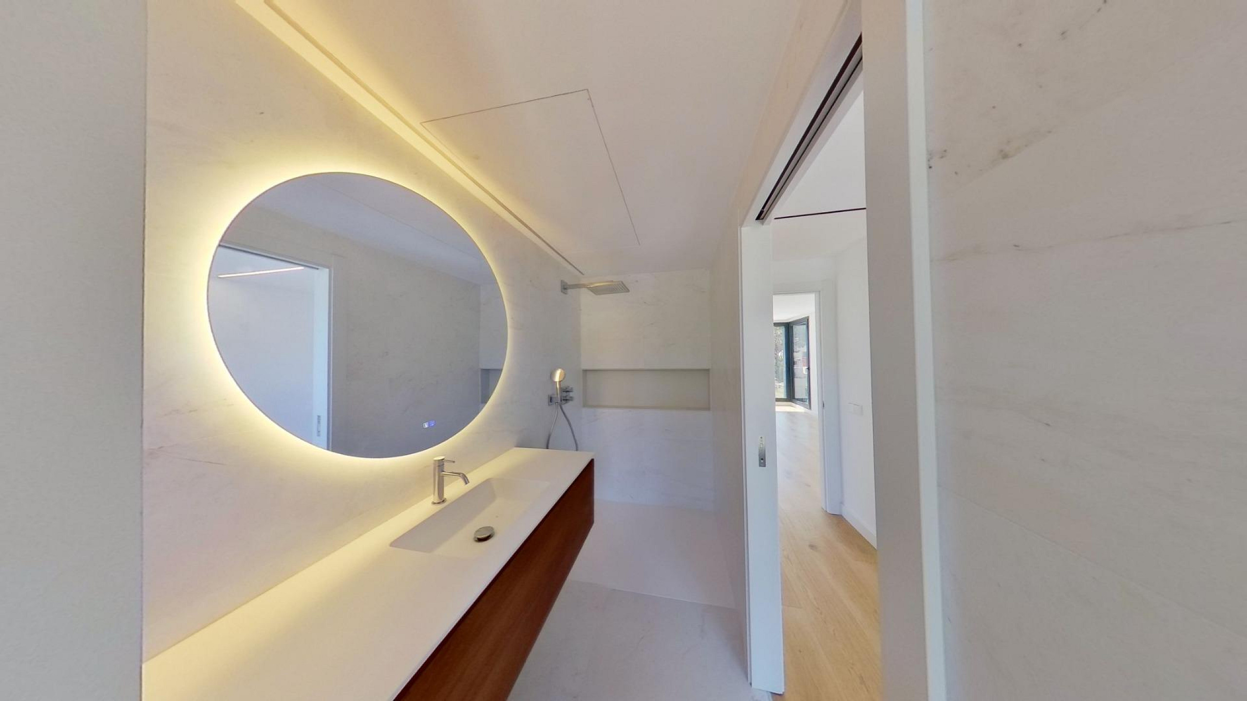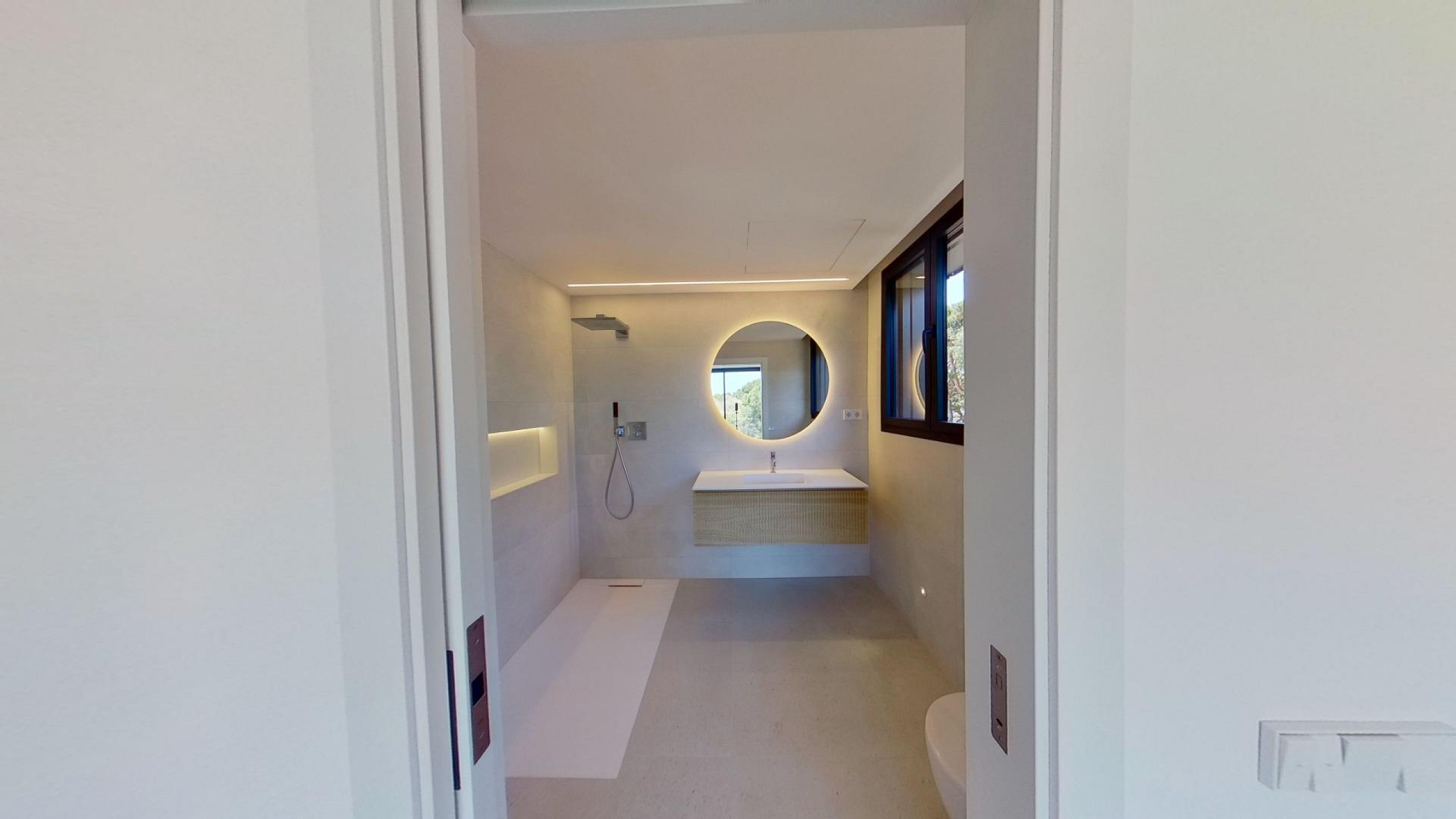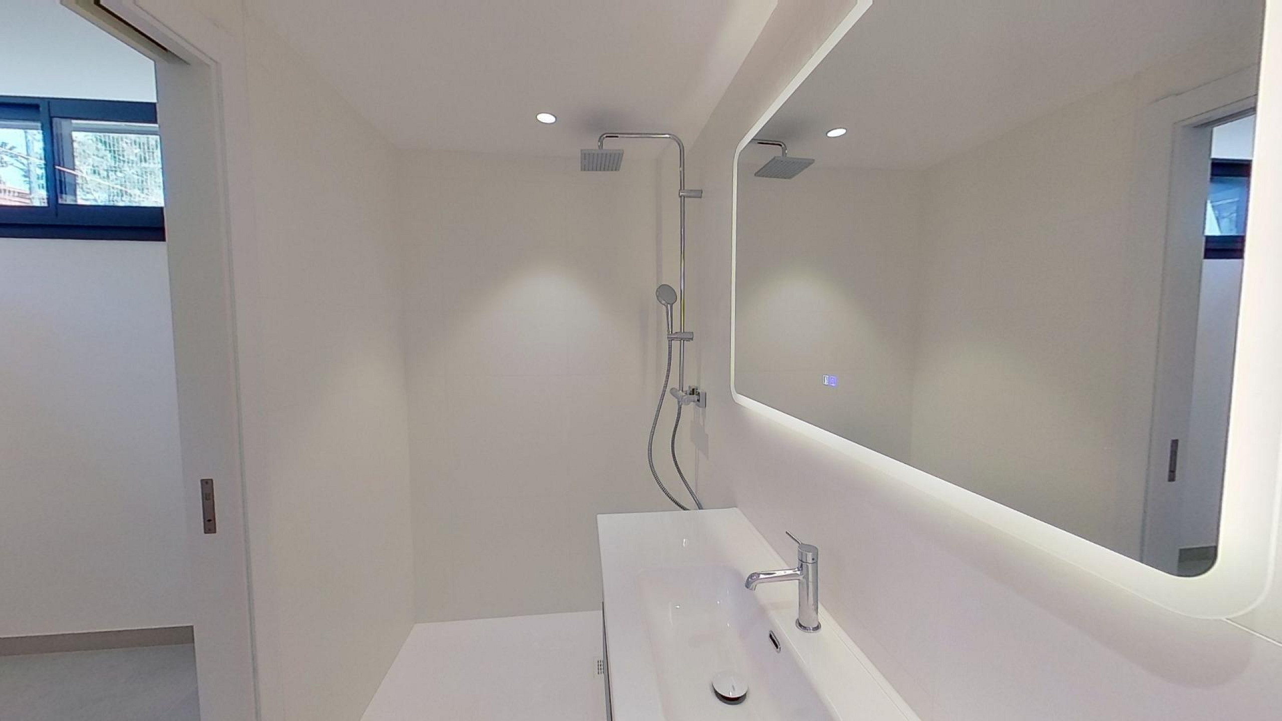 Дом оснащён передовыми технологиями и системами энергоэффективности: аэротермальная система с тёплыми полами, централизованное кондиционирование с регулировкой по зонам, солнечные панели, автоматические жалюзи и современная система «умный дом», управляемая с планшета.