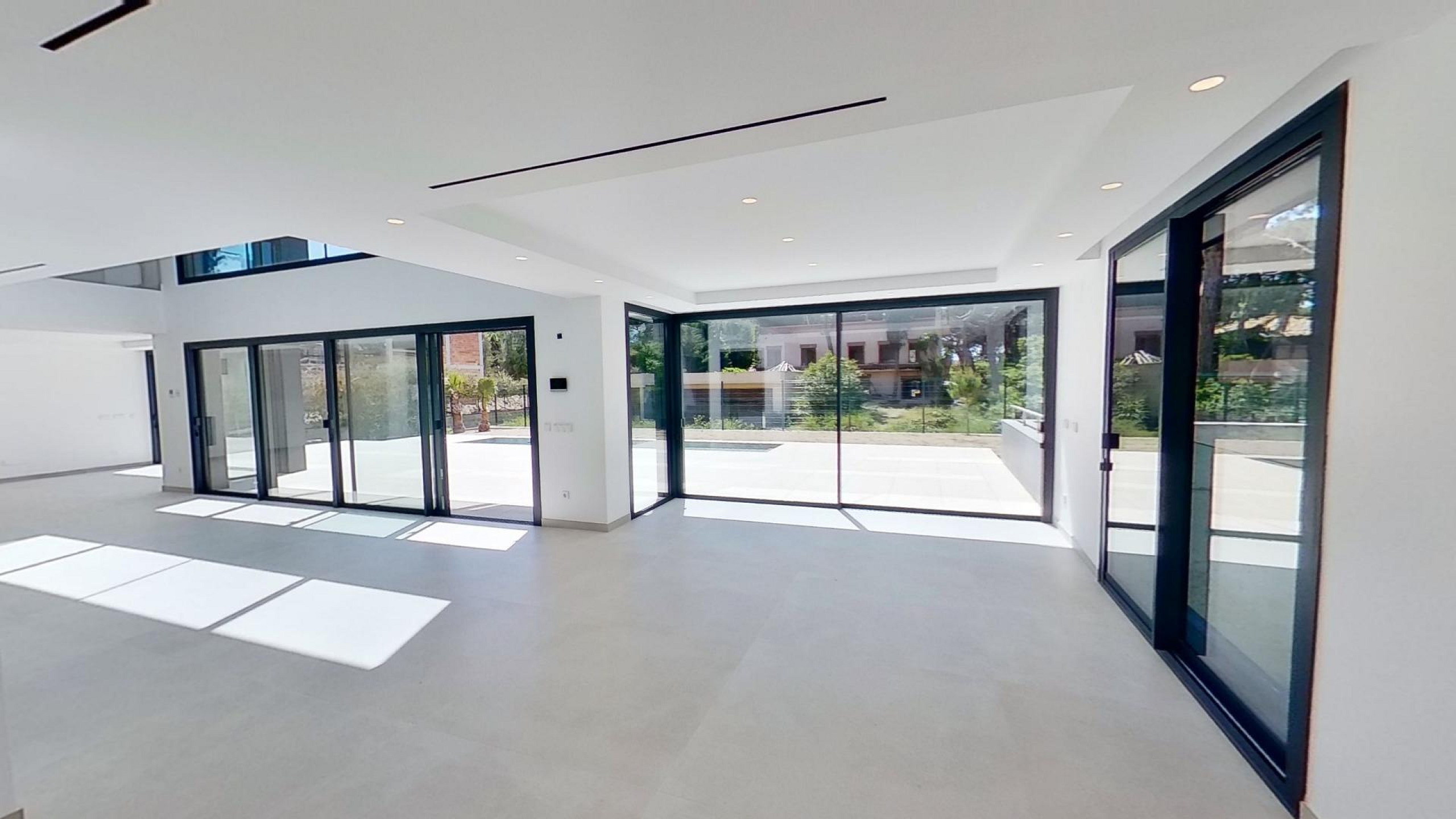 На территории расположен сад с ландшафтным дизайном, бассейн с морской водой и зоны для отдыха. Подземный гараж вмещает до 5 автомобилей.
