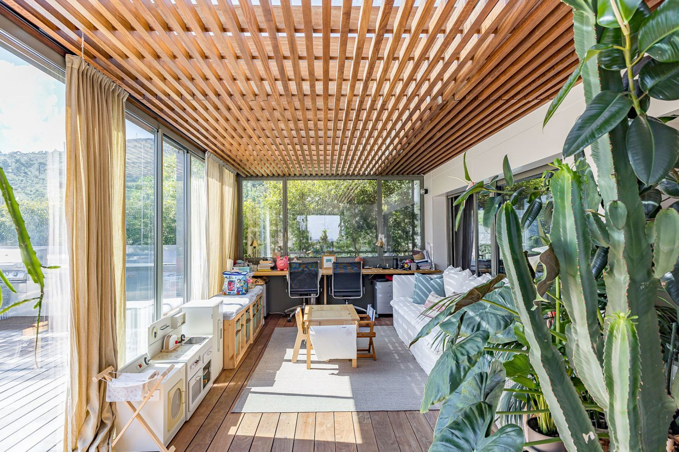 В дневной зоне находится просторная гостиная-столовая, наполненная естественным светом, отдельная столовая и семейная комната. Главная терраса с полностью оборудованной кухней и зоной барбекю идеально подходит как для вечеров с друзьями, так и для спокойного отдыха. В ночной зоне расположены три спальни, включая мастер-сьют с выходом на террасу, где предусмотрено рабочее пространство.