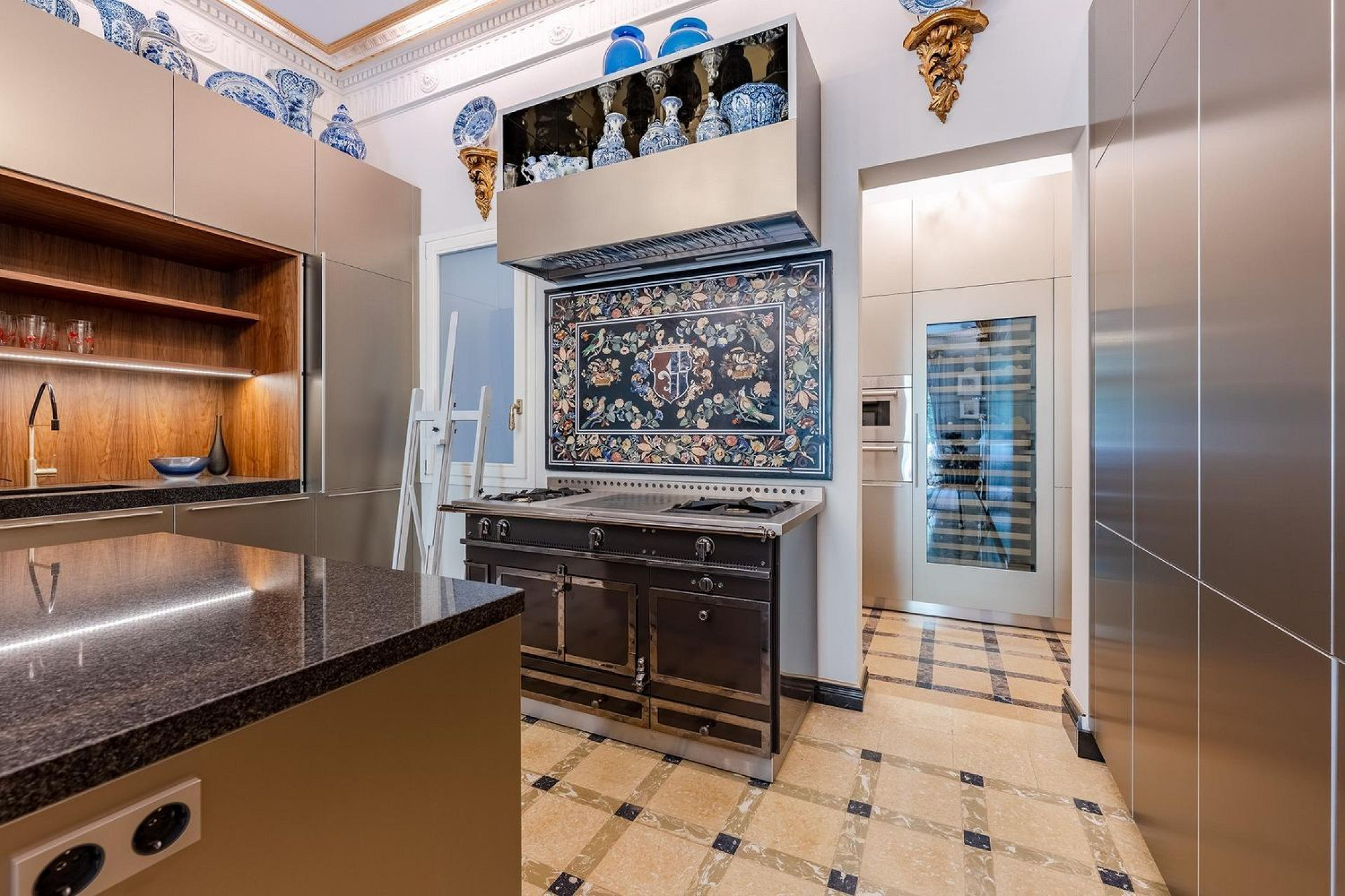 Кухня — отдельный объект восхищения: отделка из матового алюминия цвета шампанского, техника Sub-Zero и плиты La Cornue превращают повседневную готовку в кулинарный ритуал высокого уровня.