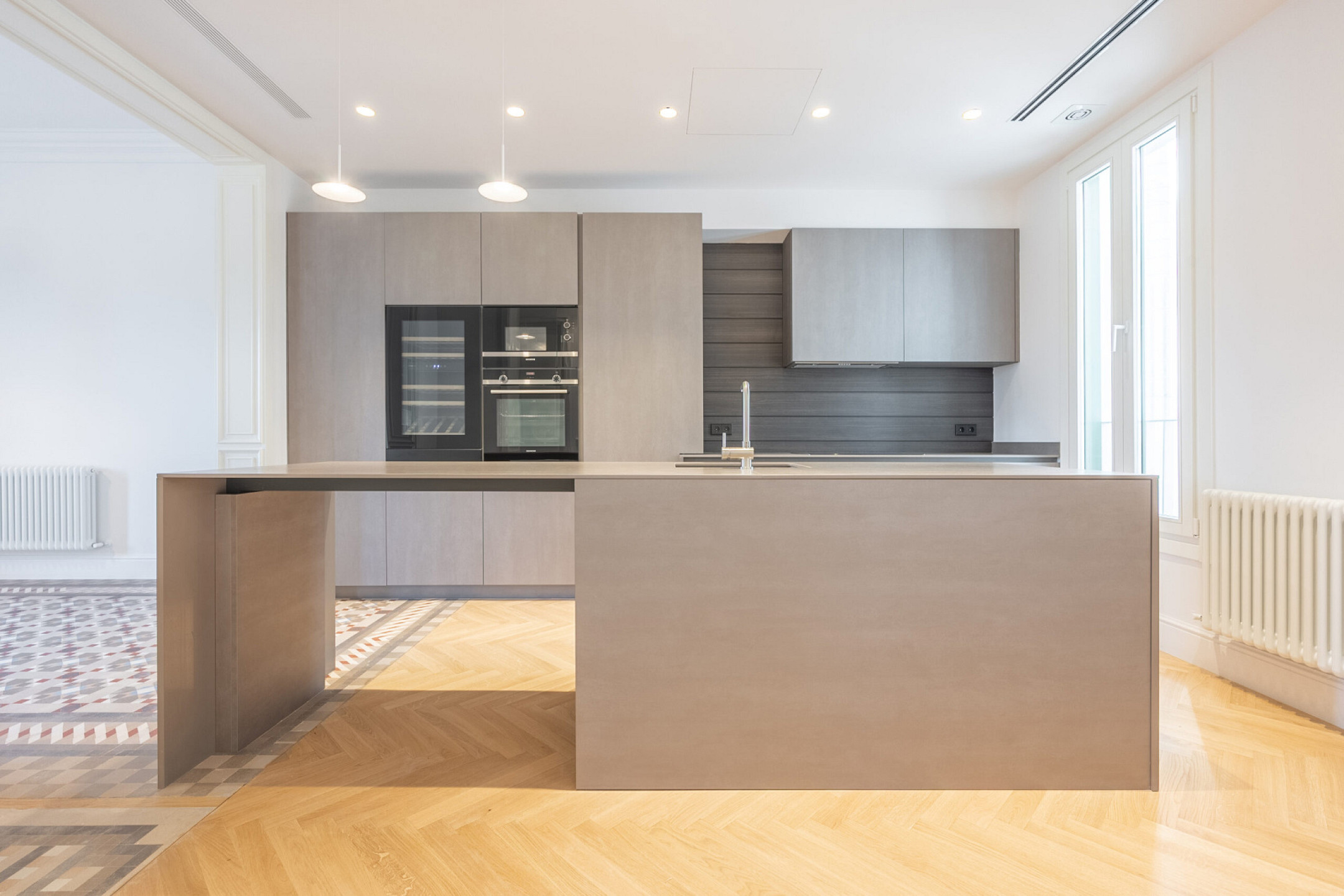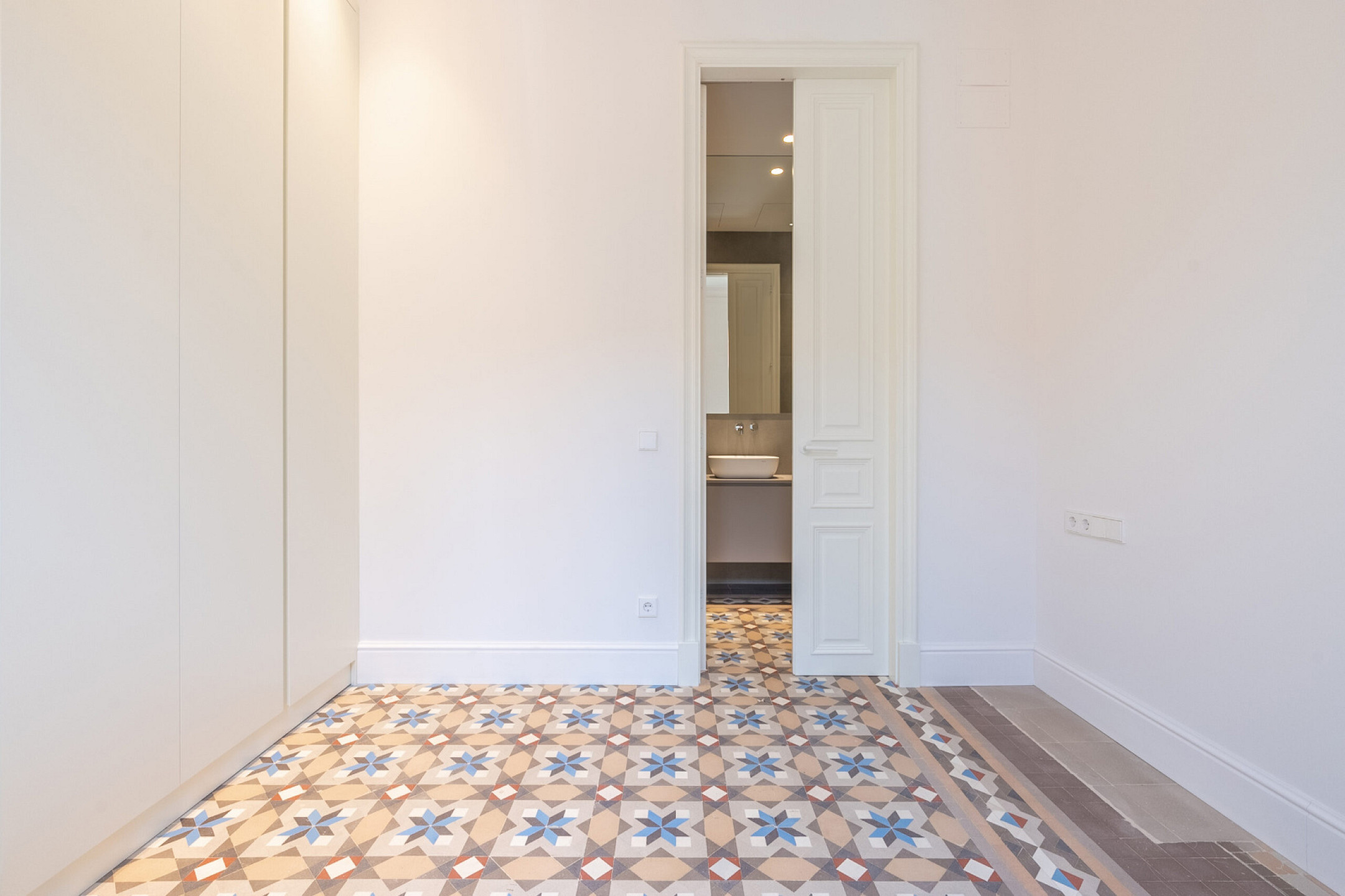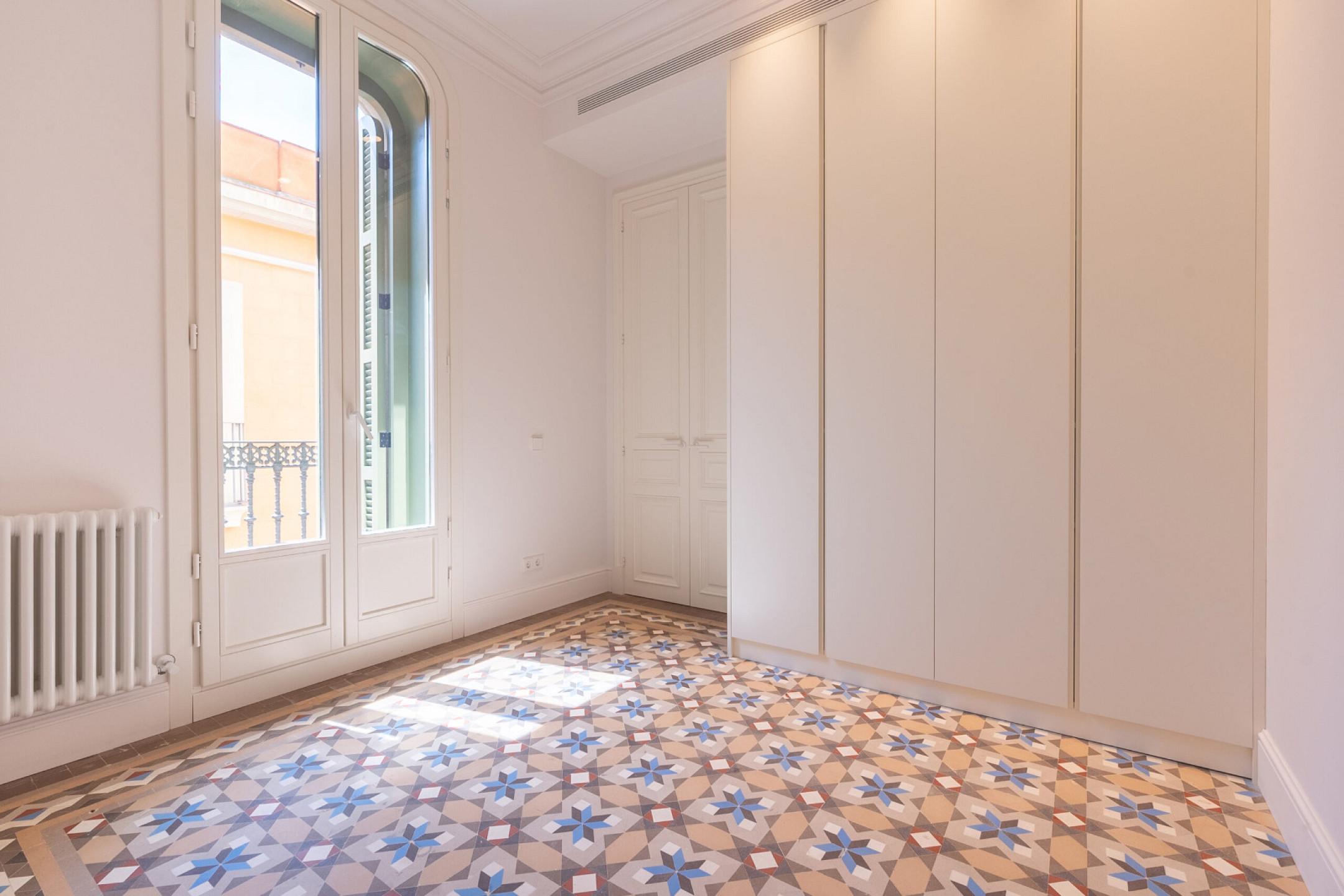 Спальная зона состоит из двух спален, двух полноценных ванных комнат и дополнительного гостевого санузла, обеспечивая комфорт и приватность. В отделке сочетаются оригинальные гидравлические плиточные полы и паркет, придающие интерьеру характер и тепло. Квартира оснащена системой кондиционирования и центральным отоплением, что гарантирует комфорт в любое время года.