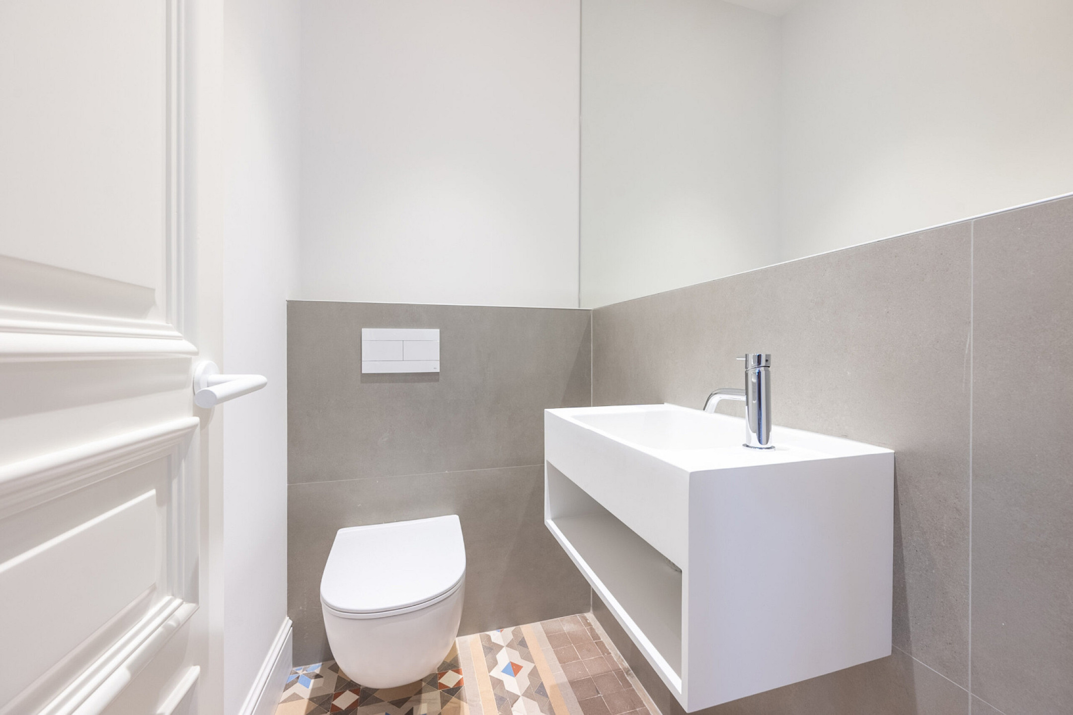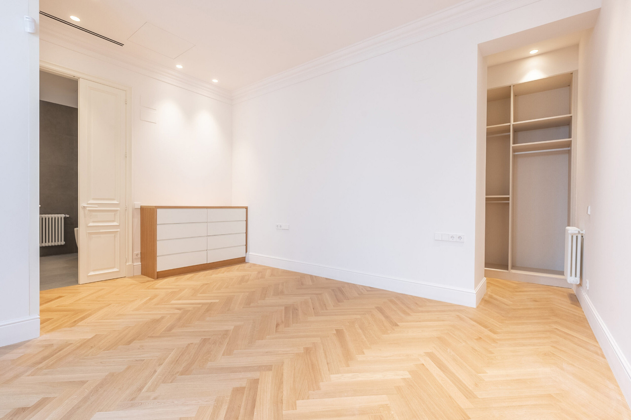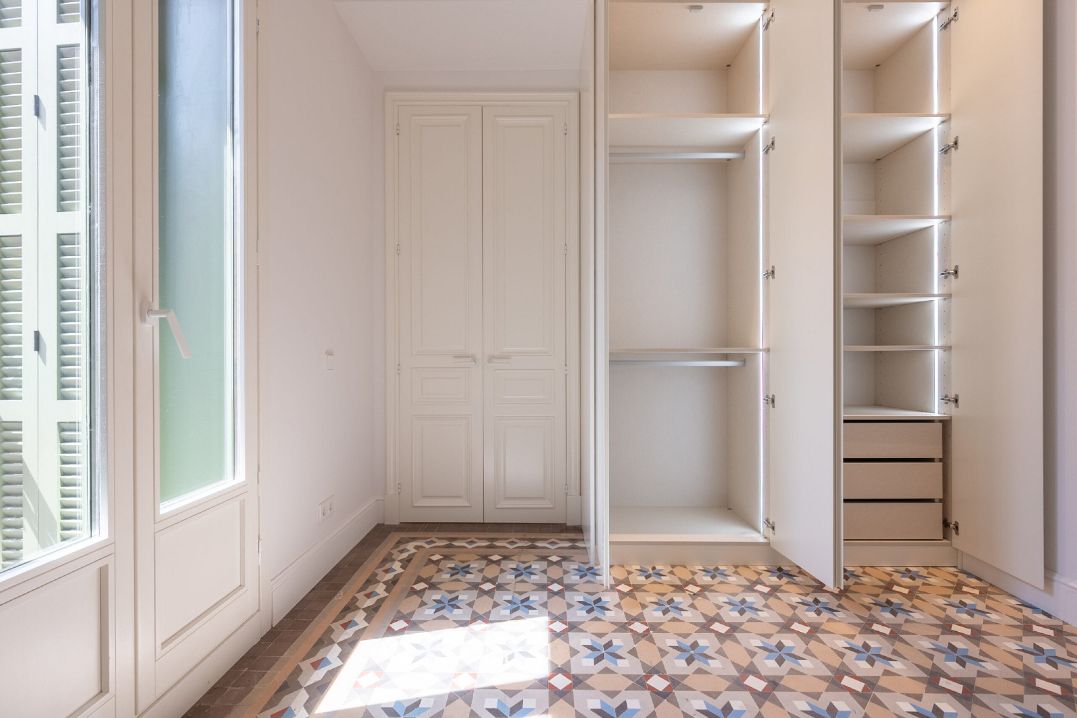 Спальная зона состоит из двух спален, двух полноценных ванных комнат и дополнительного гостевого санузла, обеспечивая комфорт и приватность. В отделке сочетаются оригинальные гидравлические плиточные полы и паркет, придающие интерьеру характер и тепло. Квартира оснащена системой кондиционирования и центральным отоплением, что гарантирует комфорт в любое время года.