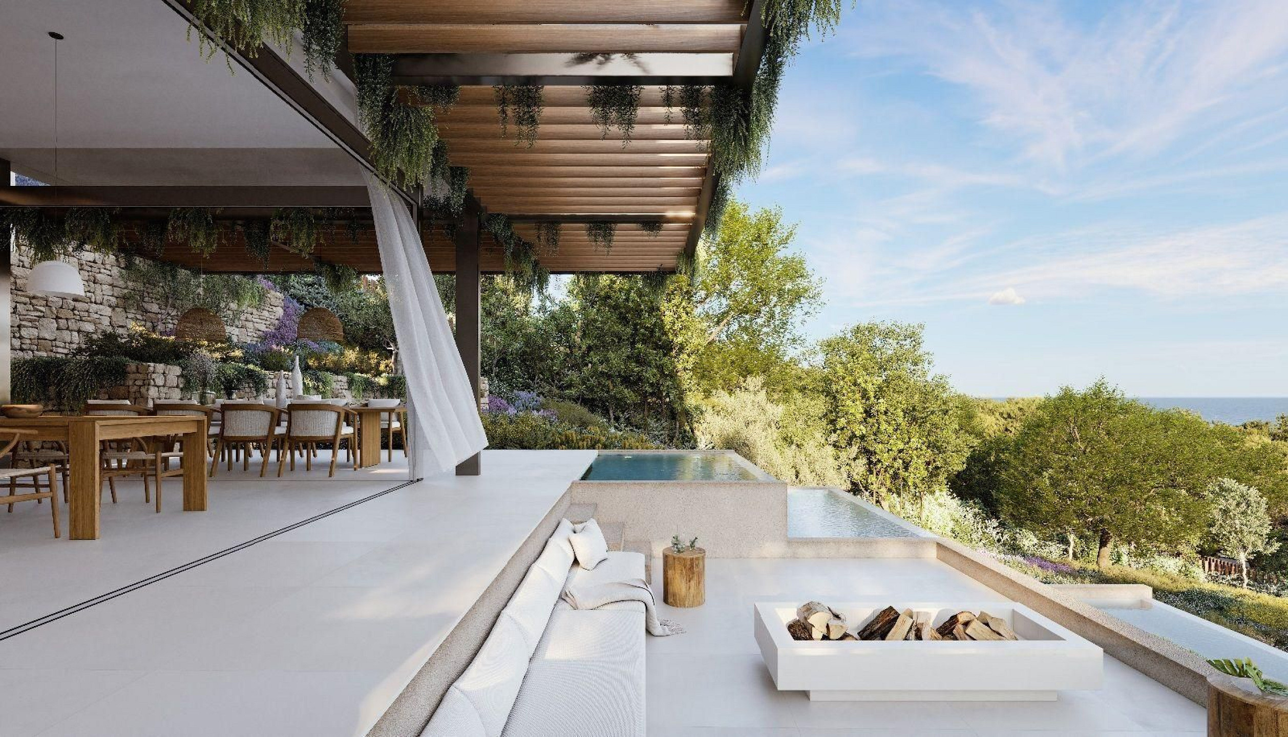 Дневная зона включает просторную гостиную, столовую и полностью оборудованную современную кухню, объединённые в светлое и открытое пространство, подходящее как для повседневной жизни, так и для приёма гостей. На этом же уровне расположена впечатляющая многоуровневая инфинити-бассейн с просторной террасой и открытыми видами на море.
