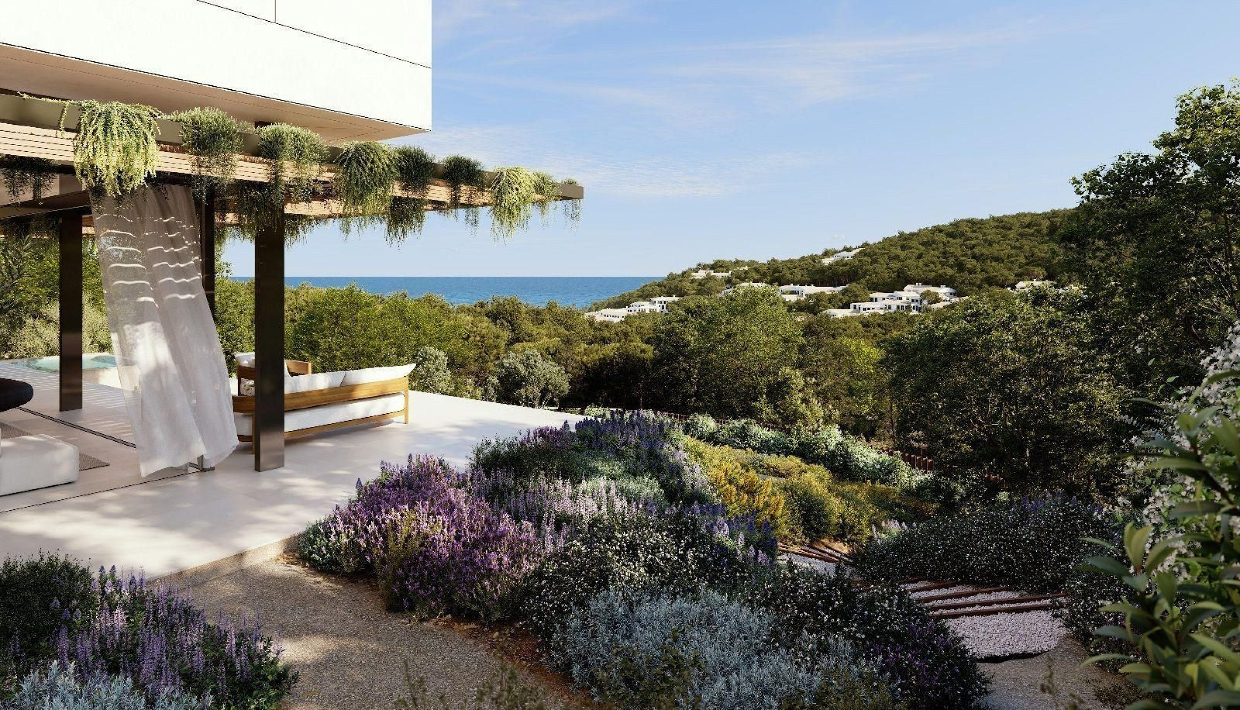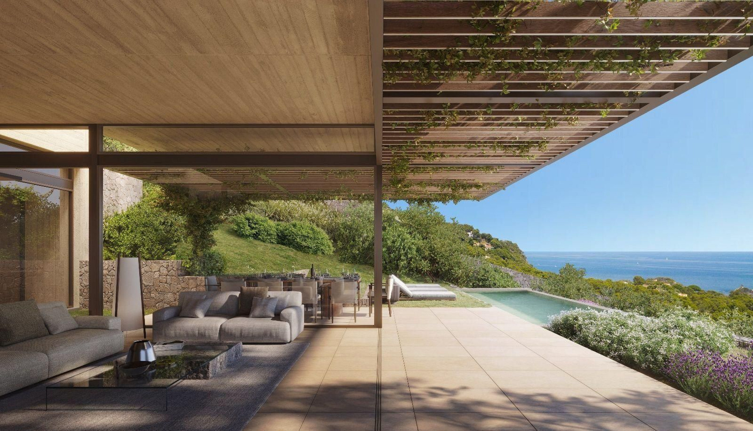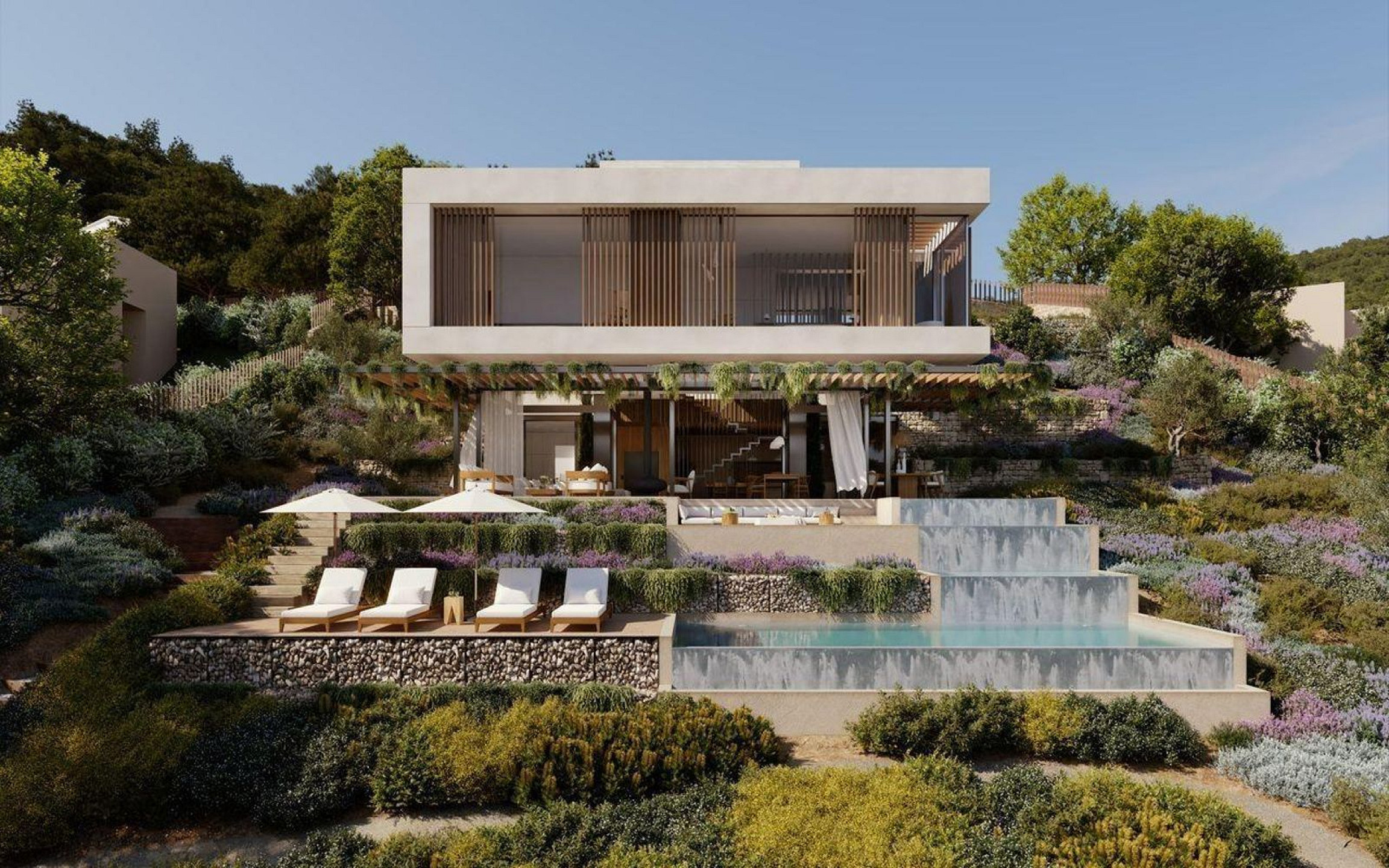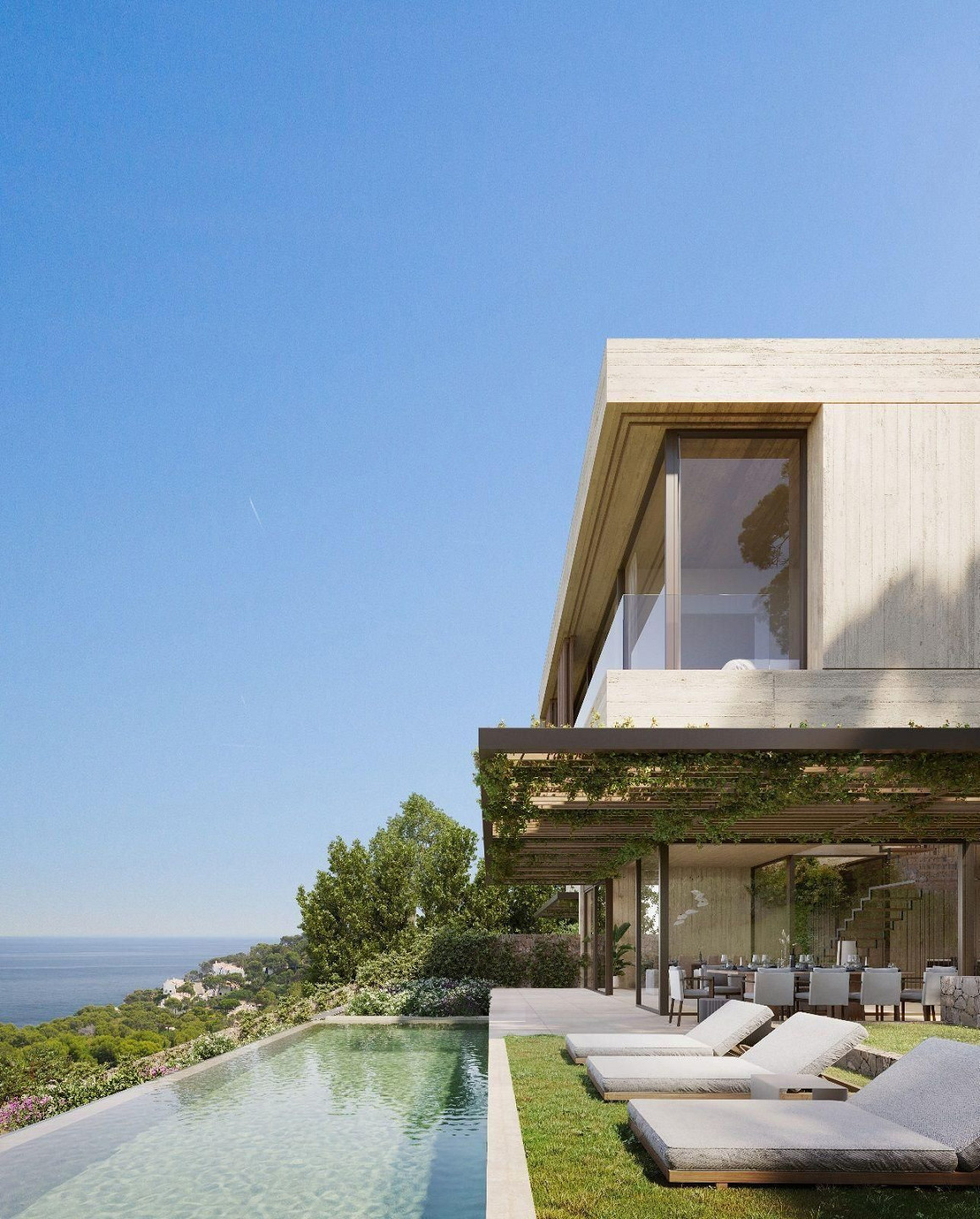 Вилла выполнена в элегантном и вневременном современном архитектурном стиле, с акцентом на просторные помещения, приватность и постоянную связь с средиземноморским ландшафтом. Большие панорамные окна открывают основные жилые зоны к внешнему пространству, обеспечивая захватывающие виды на море и окружающую природу.