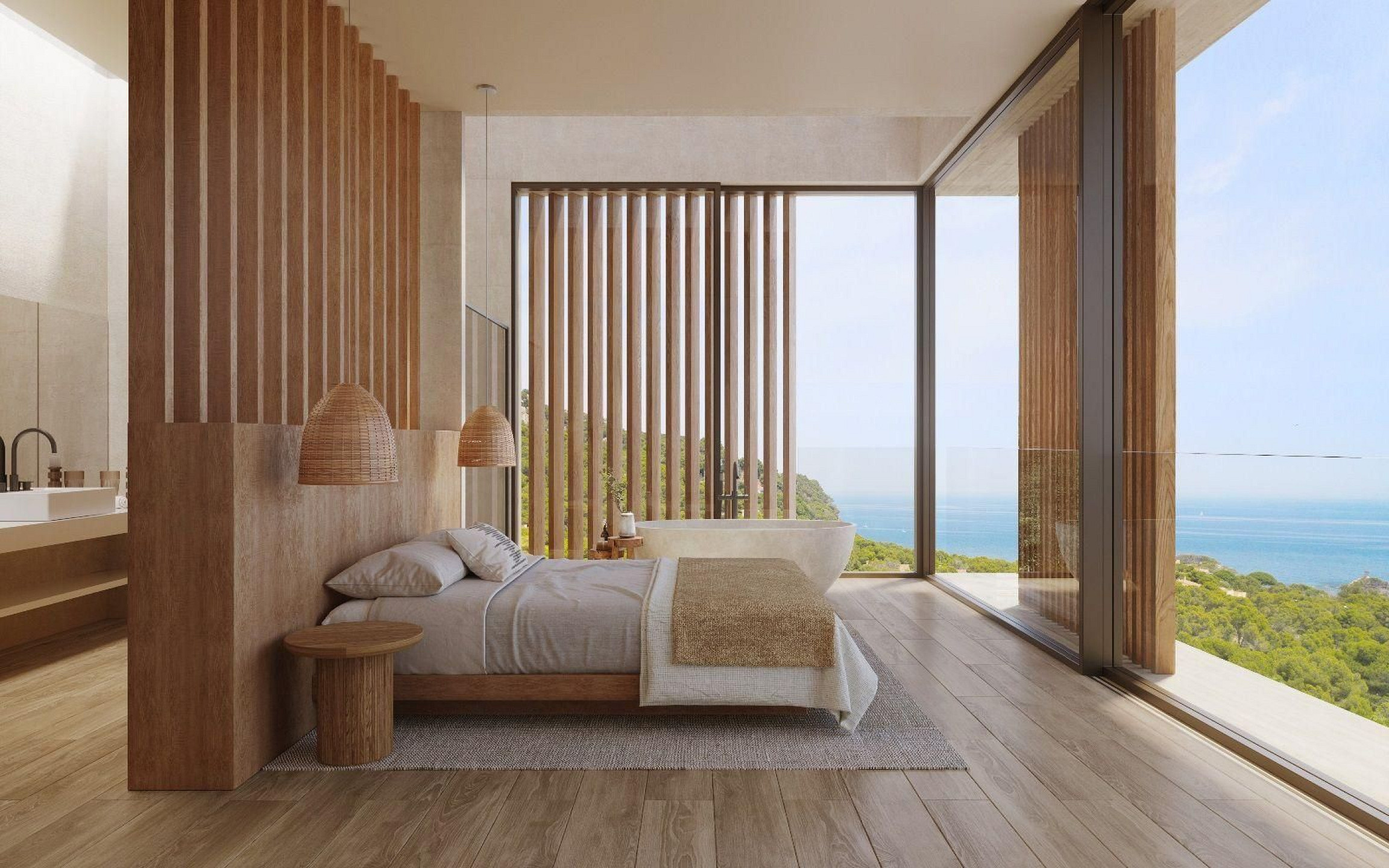 В доме предусмотрено пять спален, каждая с собственной ванной комнатой, что обеспечивает высокий уровень комфорта и приватности. Планировка продумана таким образом, чтобы обеспечить функциональность, спокойствие и чёткое разделение общественных и приватных зон.