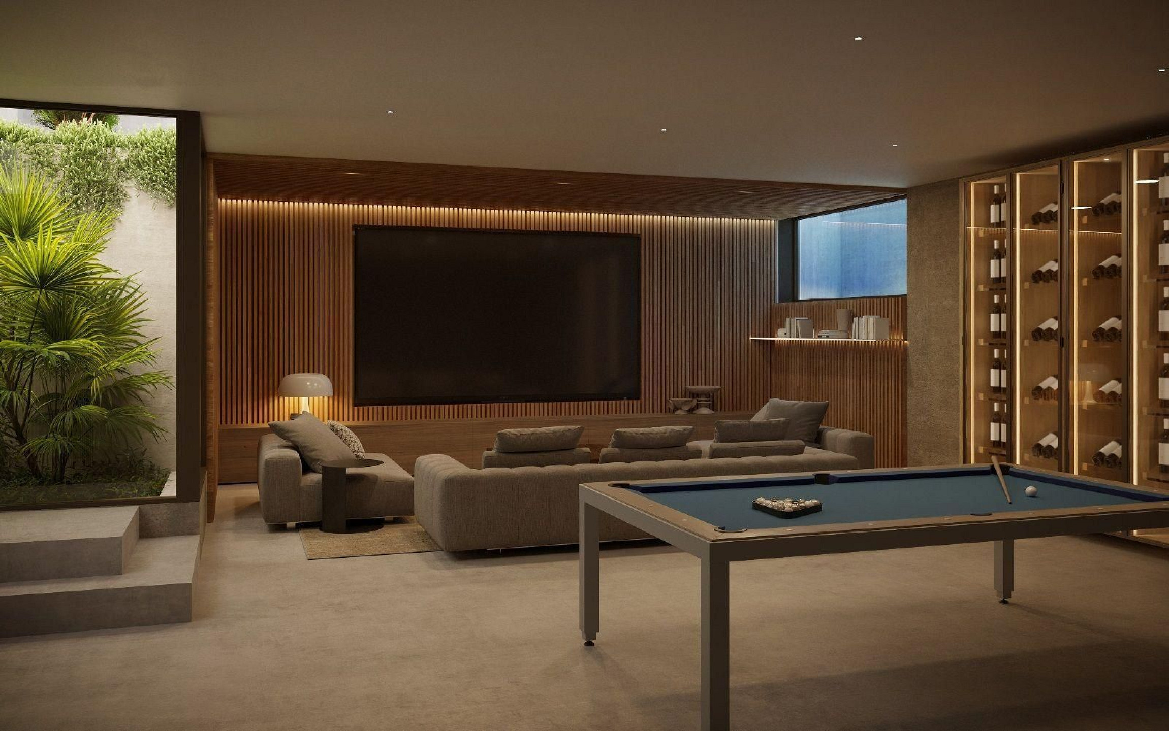 Нижний уровень посвящён отдыху и оздоровлению и включает тренажёрный зал, сауну, домашний кинотеатр и бильярдную. Здесь же расположены климатизированный винный погреб, техническое помещение, прачечная и гостевой санузел. Дополняют объект просторные зоны для парковки и хранения.