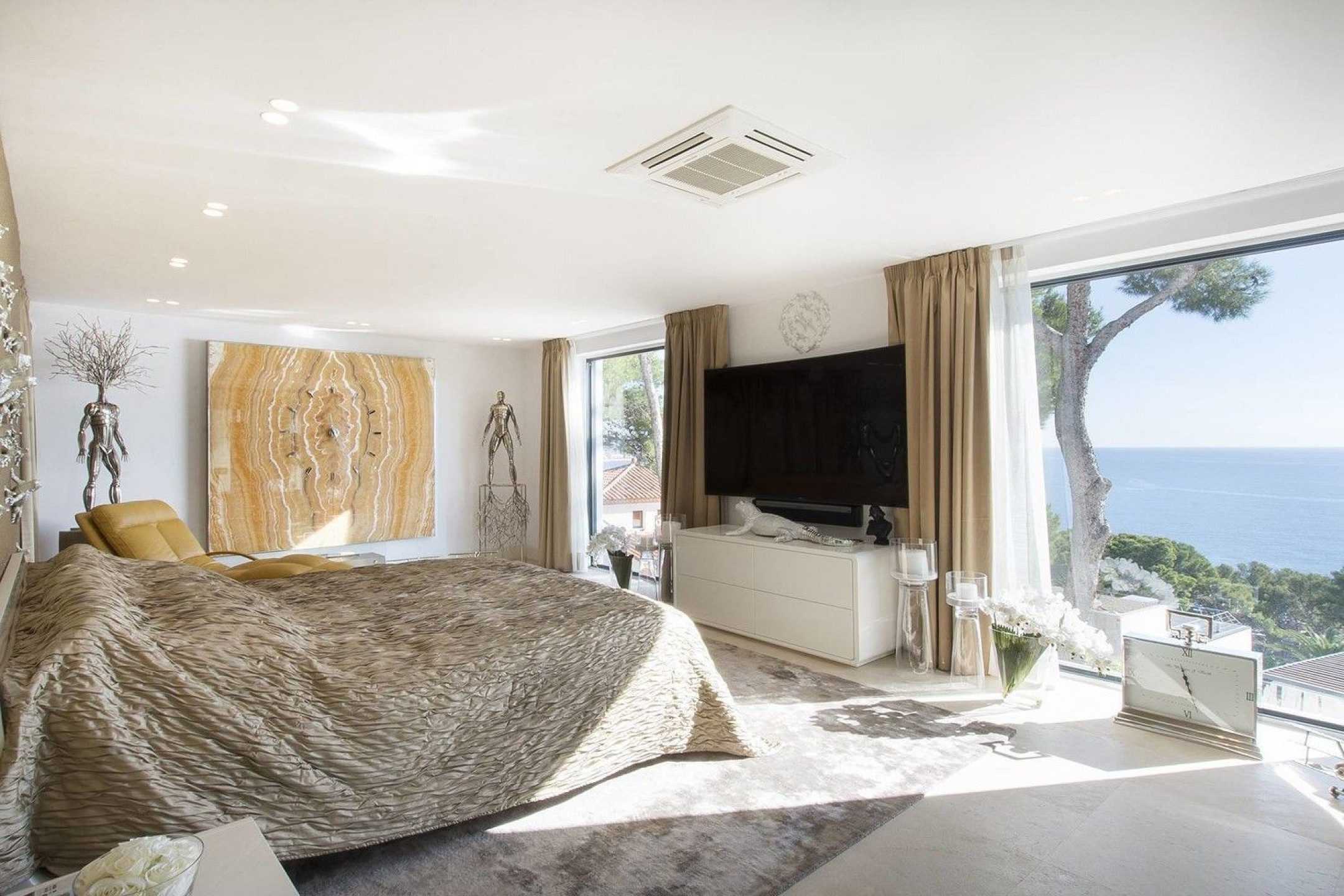 - На первом этаже находится главная спальня с гардеробной, полной ванной и великолепным видом на море.