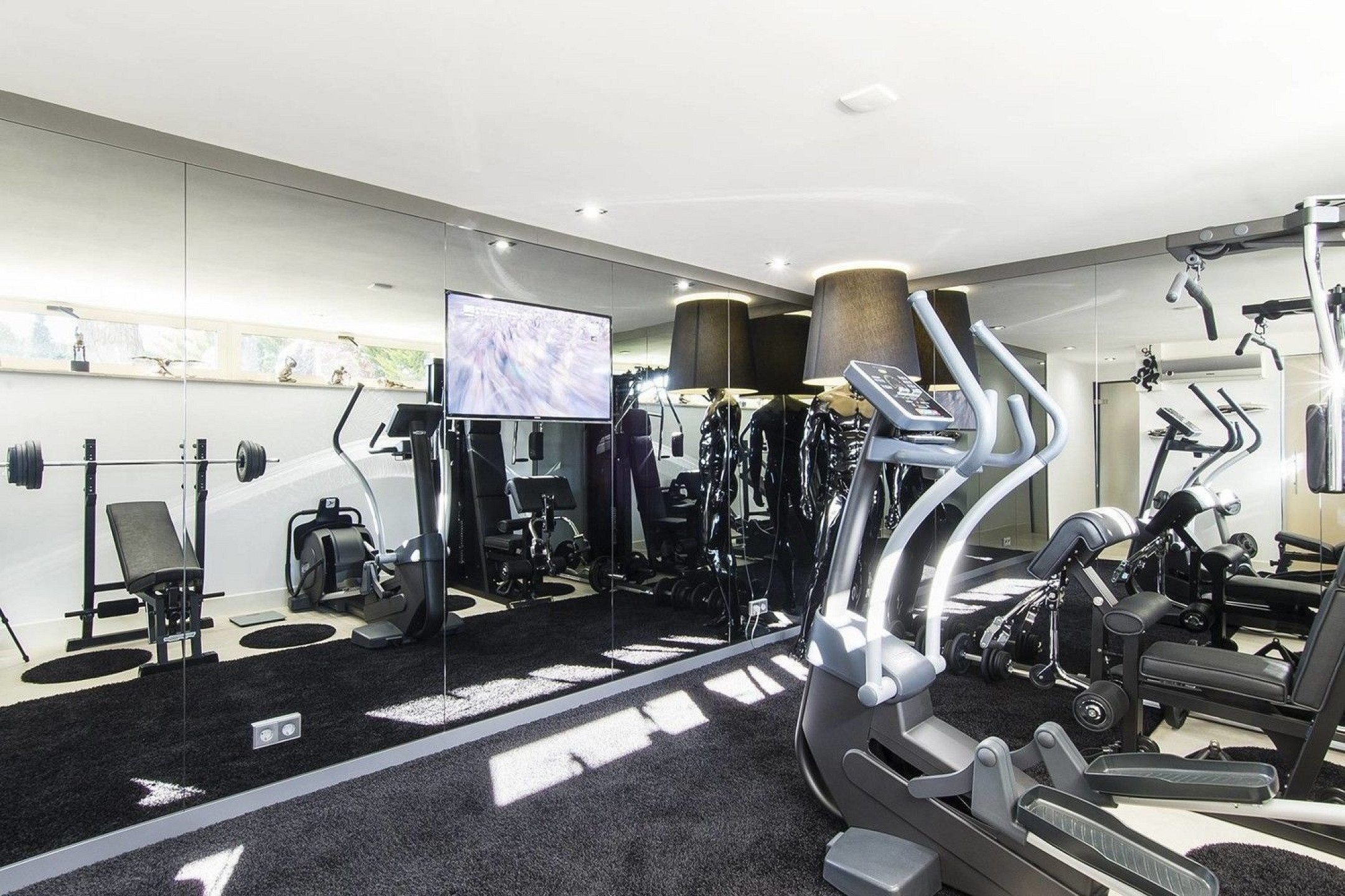 - На нижнем этаже находятся тренажерный зал, спа с сухой и влажной сауной и ванная комната.