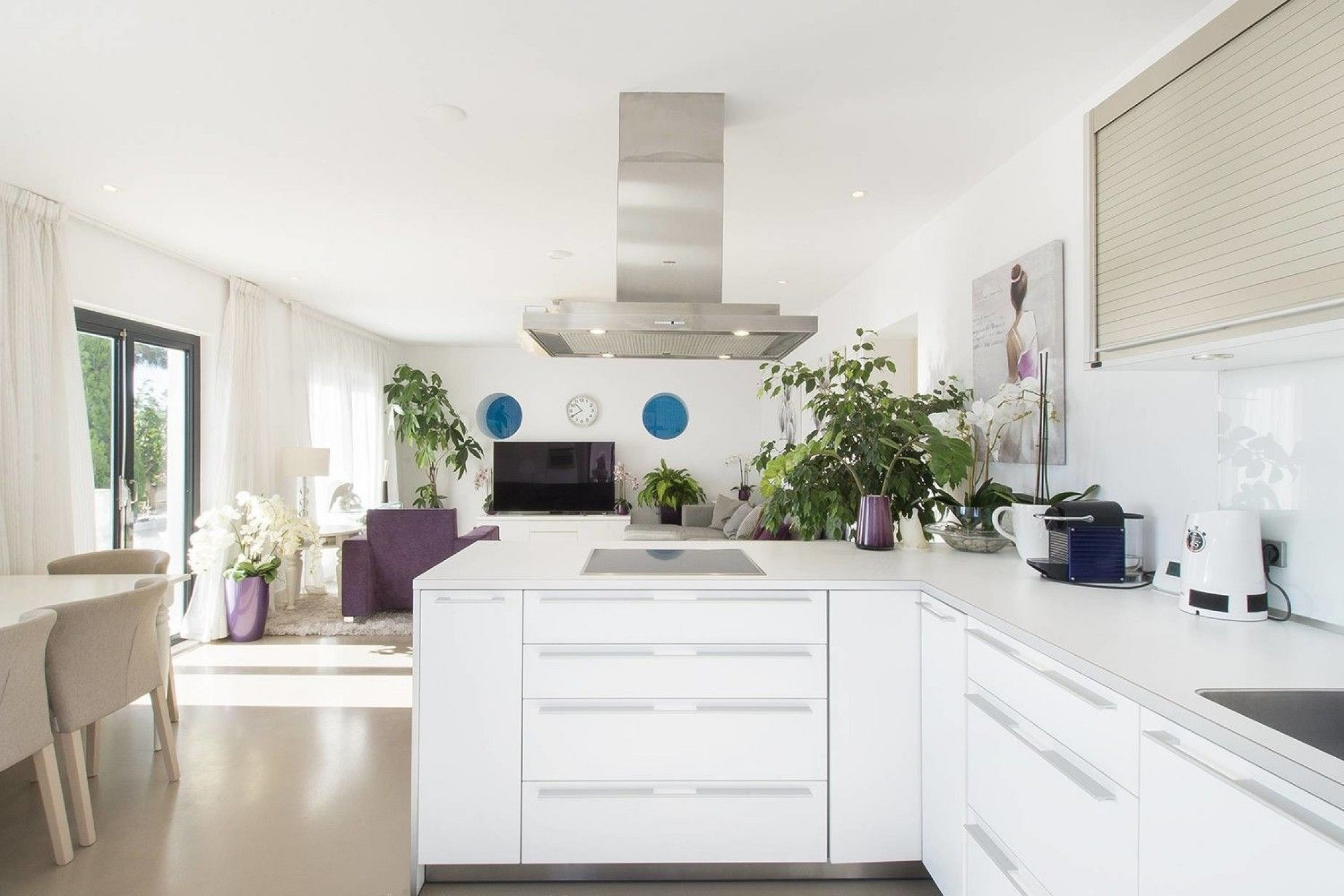 - На главном этаже расположена просторная гостиная-столовая с выходом на великолепную террасу, полностью оборудованная кухня, прачечная и гостевой санузел.