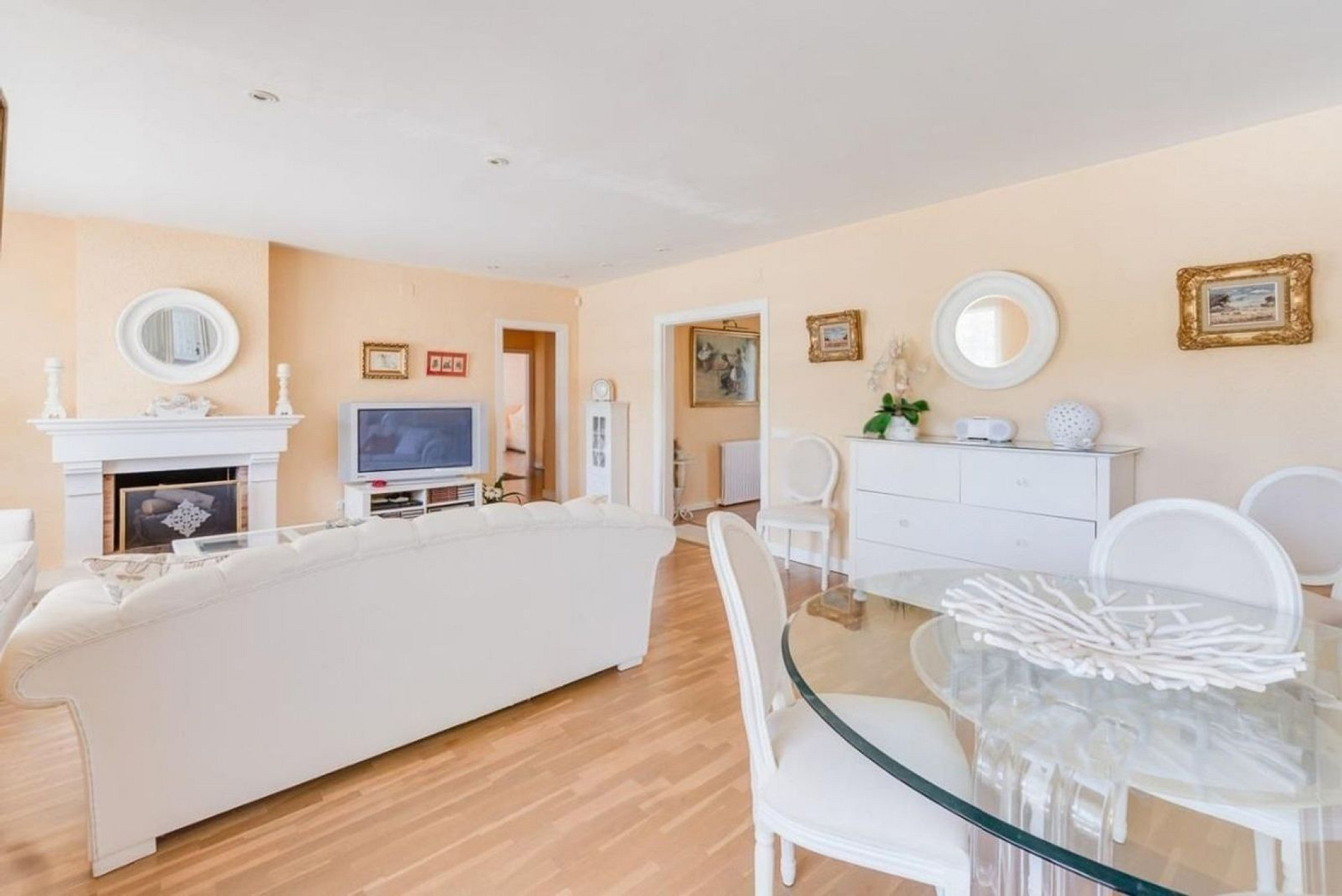 На первом уровне находится прихожая, ведущая в полностью оборудованную кухню с обеденной зоной и прачечной, а также в просторную гостиную с камином и выходом на крытую террасу и в сад.