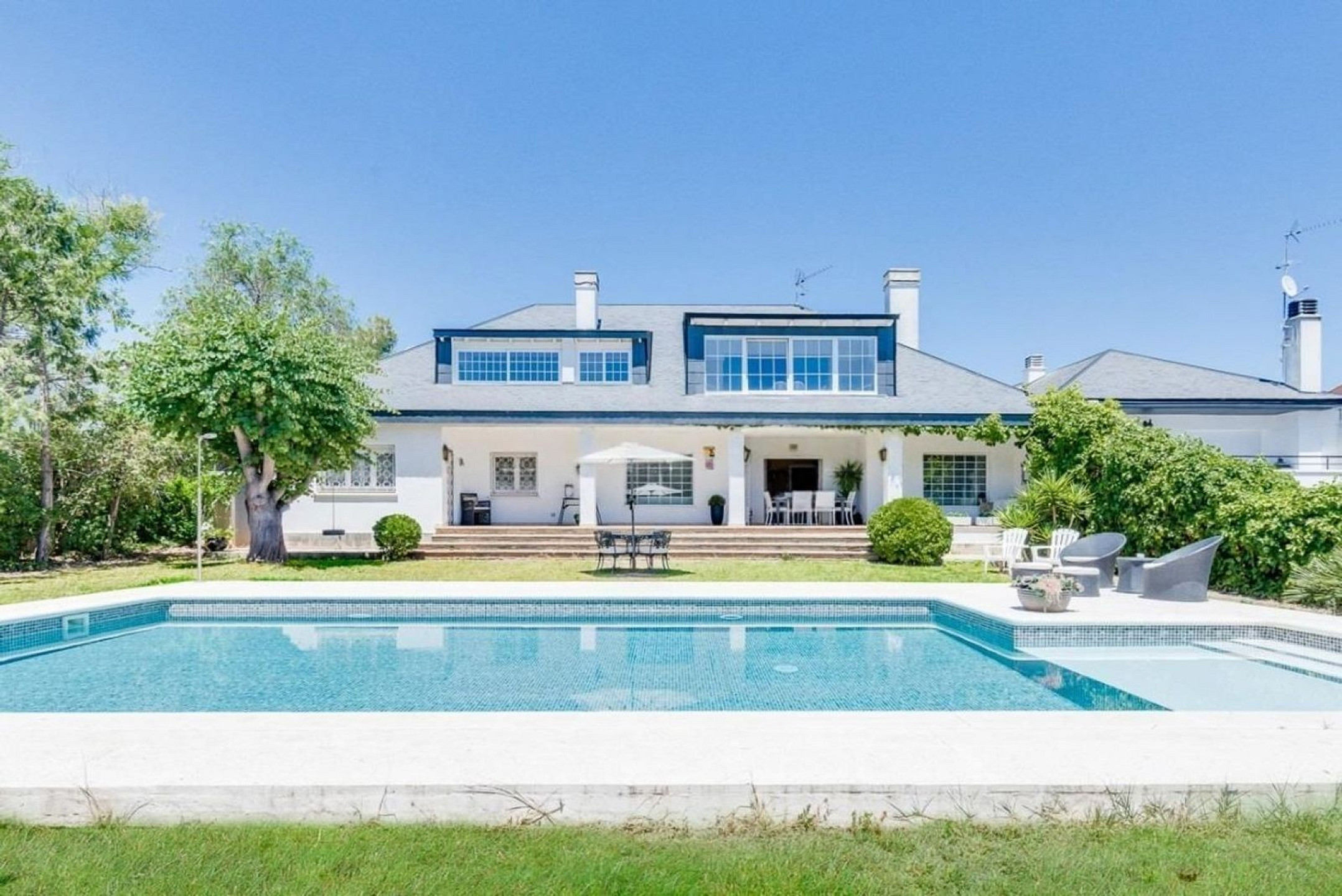 Участок включает ухоженный сад с недавно обновлённым бассейном с солёной водой, уличным душем и технической зоной — идеальное пространство для отдыха.