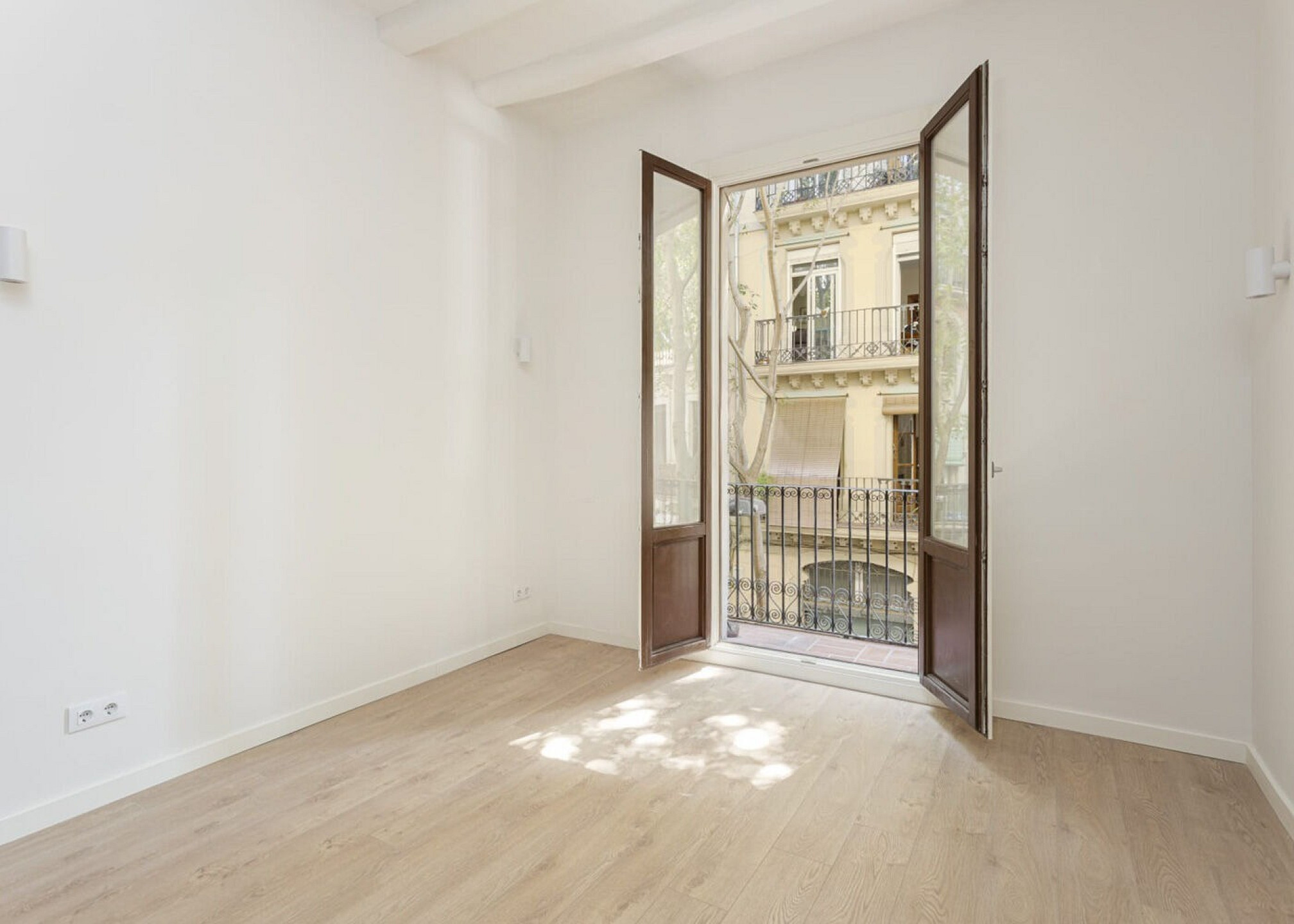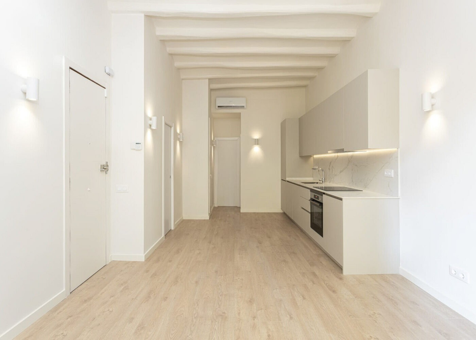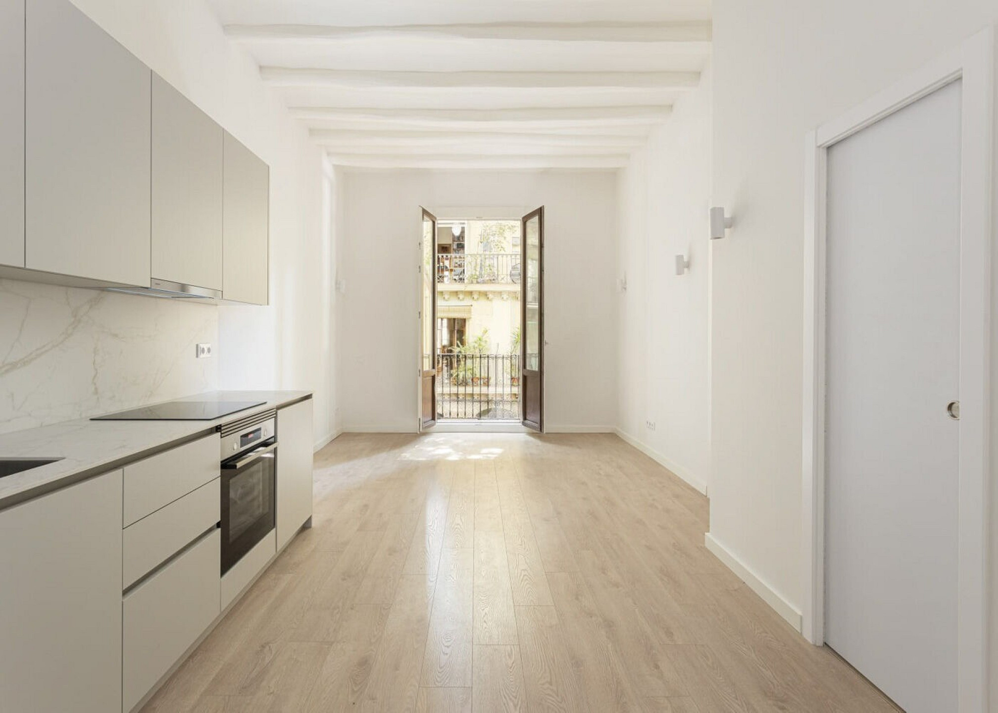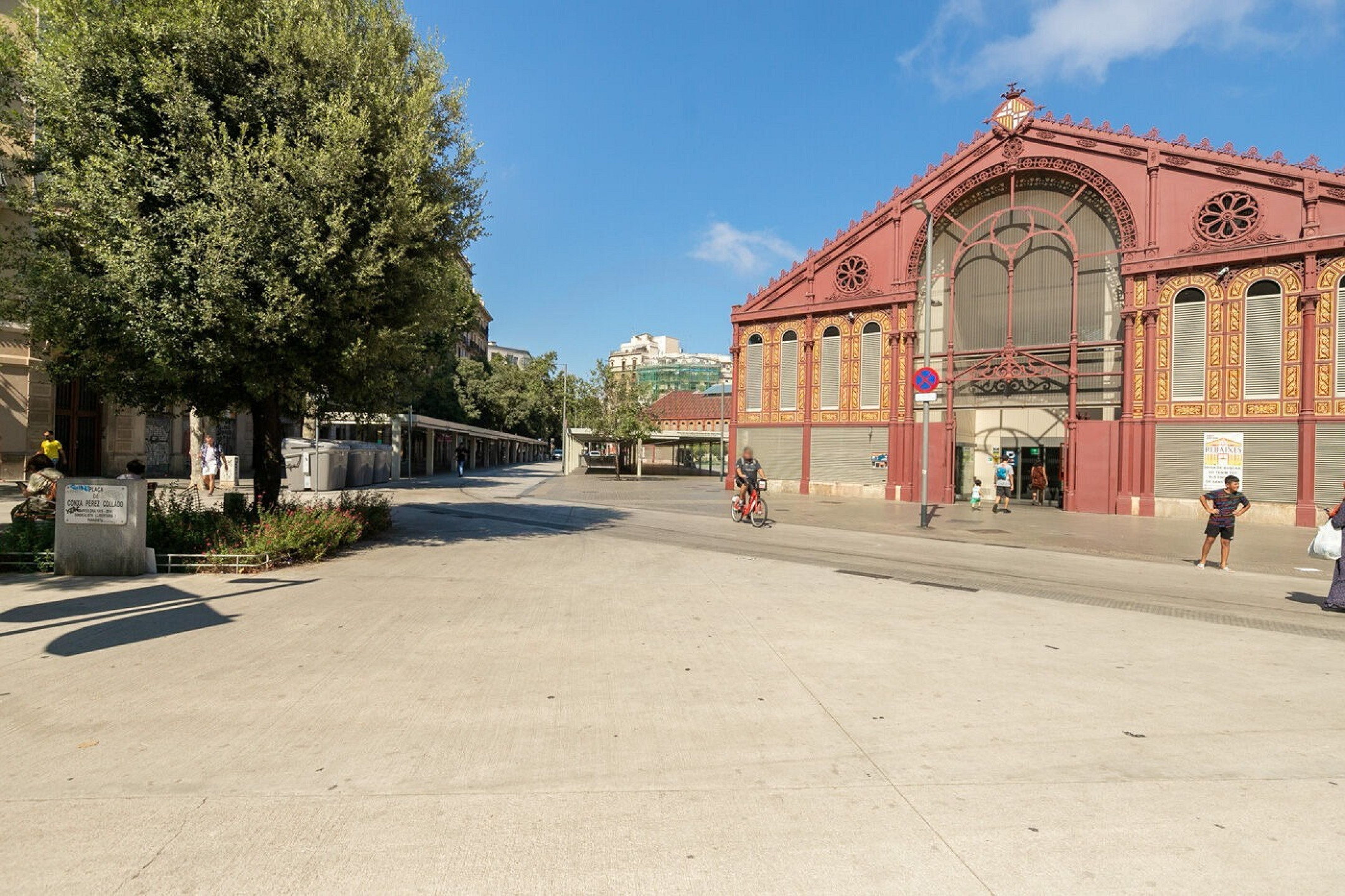Внутри сохранены оригинальные элементы: высокие потолки с каталонскими сводами и открытые деревянные балки, создающие светлую и выразительную атмосферу. Гостиная открытой планировки выходит на балкон с видом на оживлённый район Монжуик.