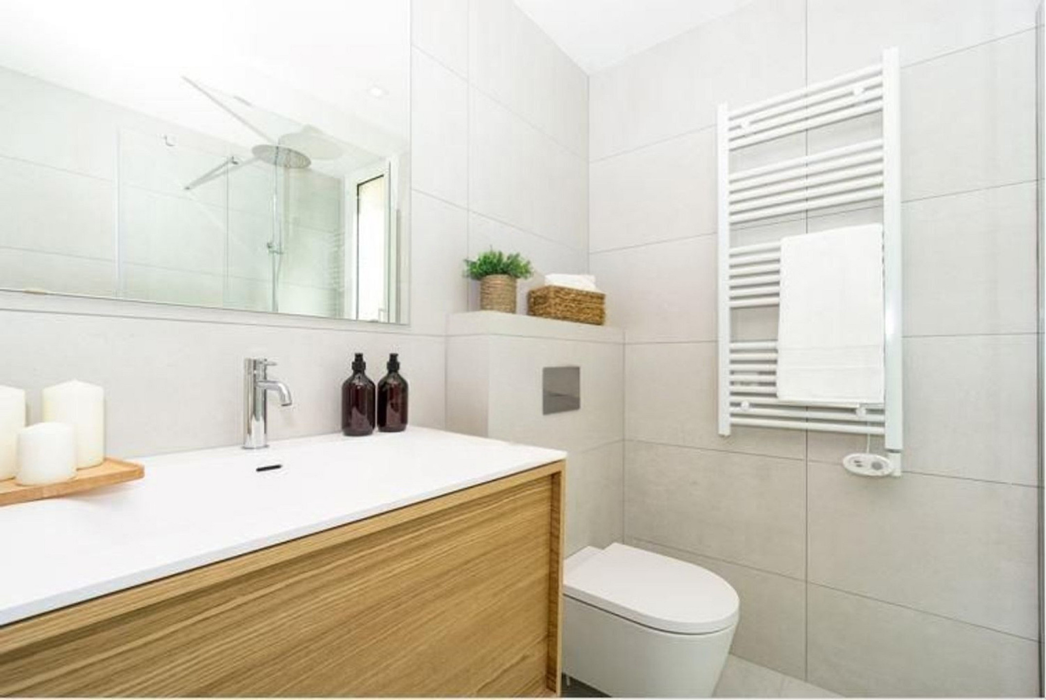Приватная зона включает две просторные спальни, одна из которых имеет собственную ванную комнату, обеспечивая комфорт и приватность. Квартира также оснащена центральной системой климат-контроля на базе аэротермии и скрытым потолочным освещением, подчёркивающим премиальный уровень объекта.