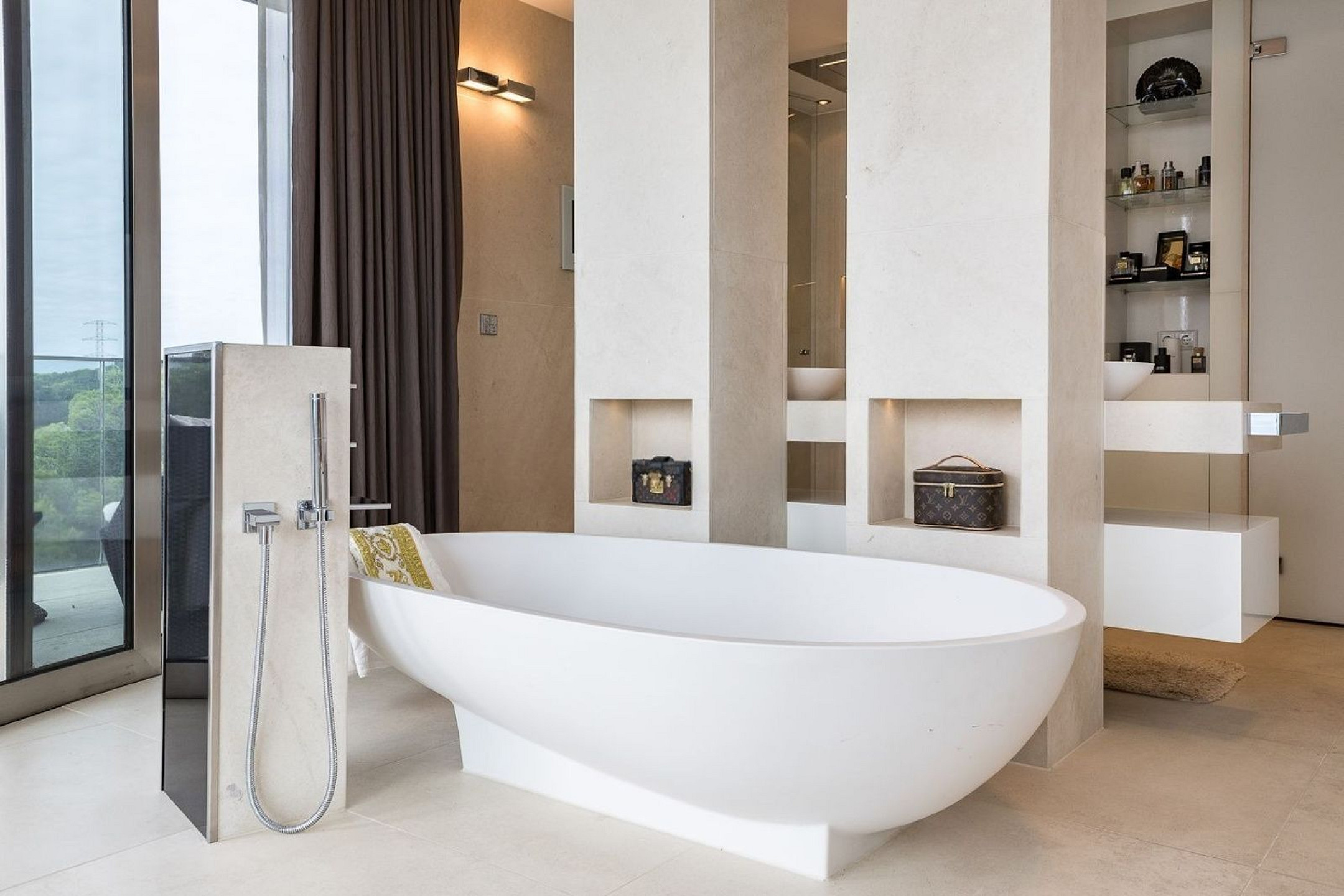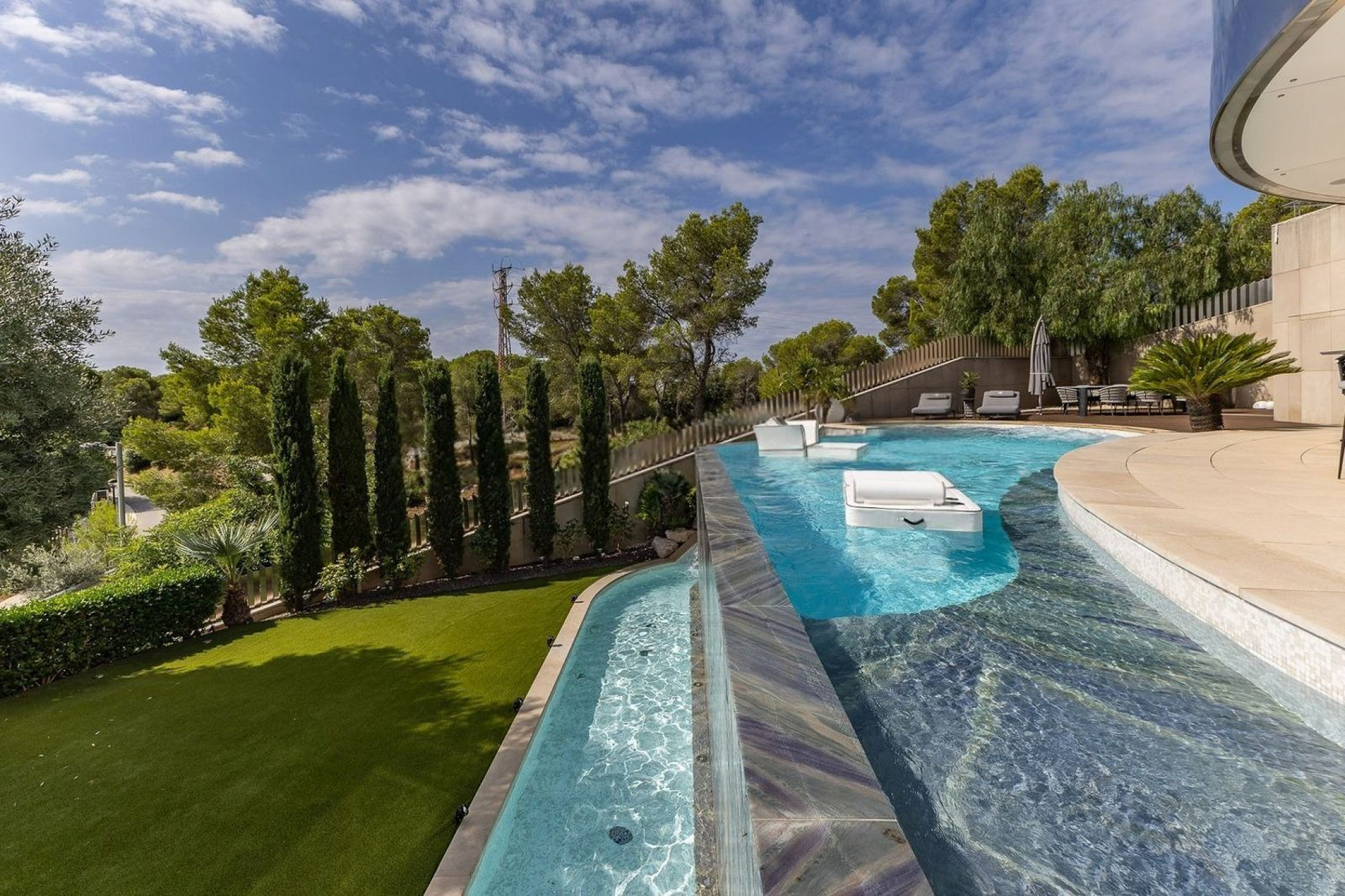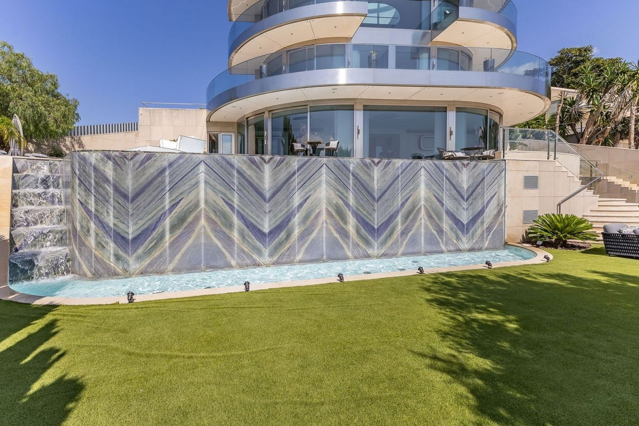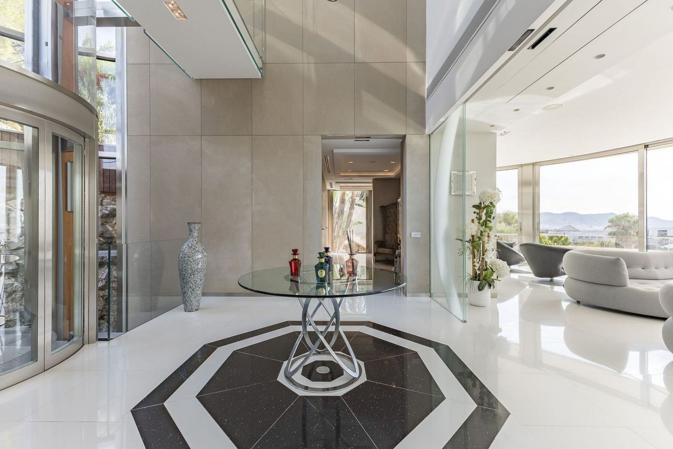 Вилла оснащена частным бассейном, джакузи, полностью оборудованным тренажёрным залом, системой сигнализации, защитными дверями и внутренним лифтом, соединяющим все этажи.