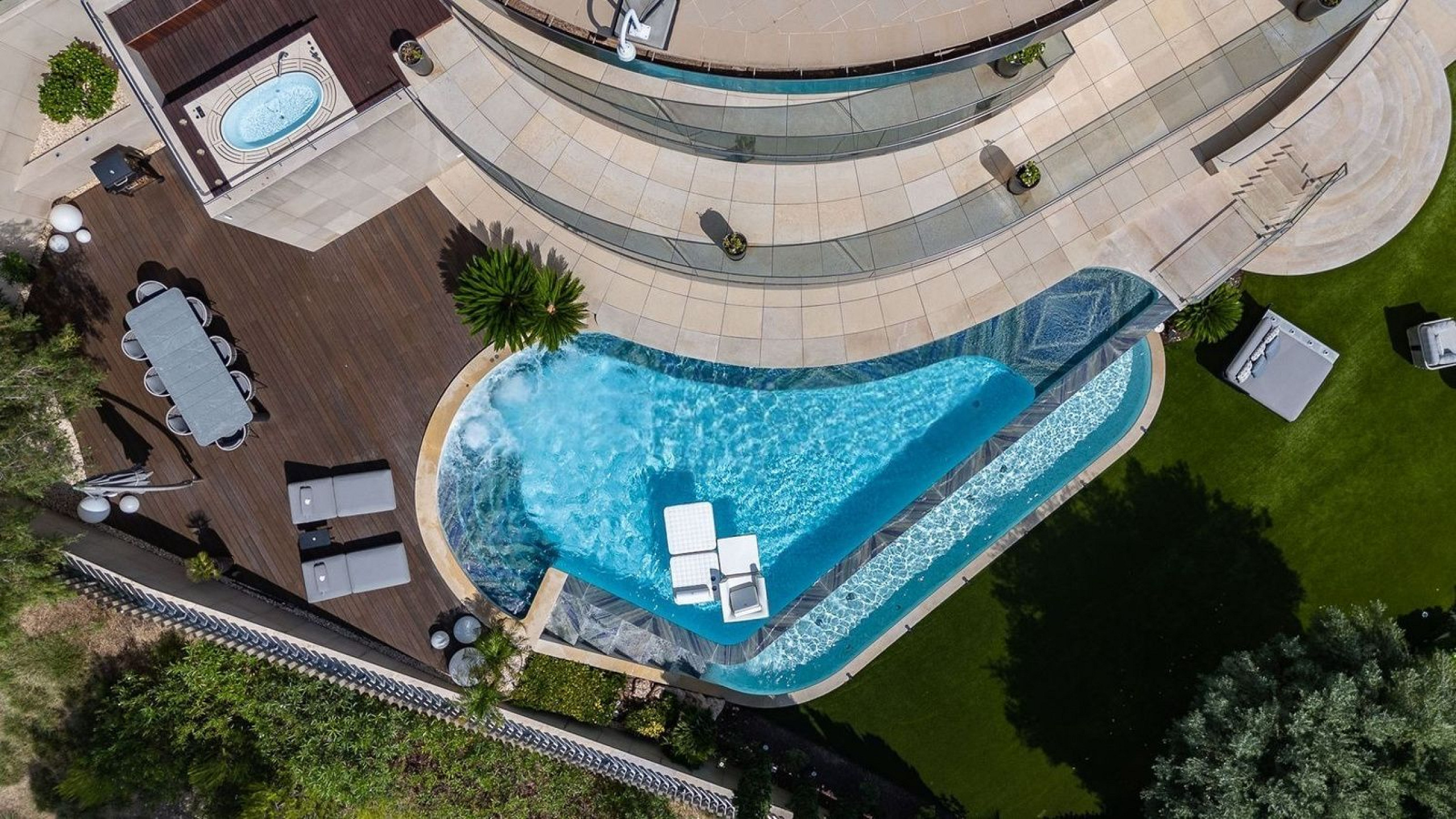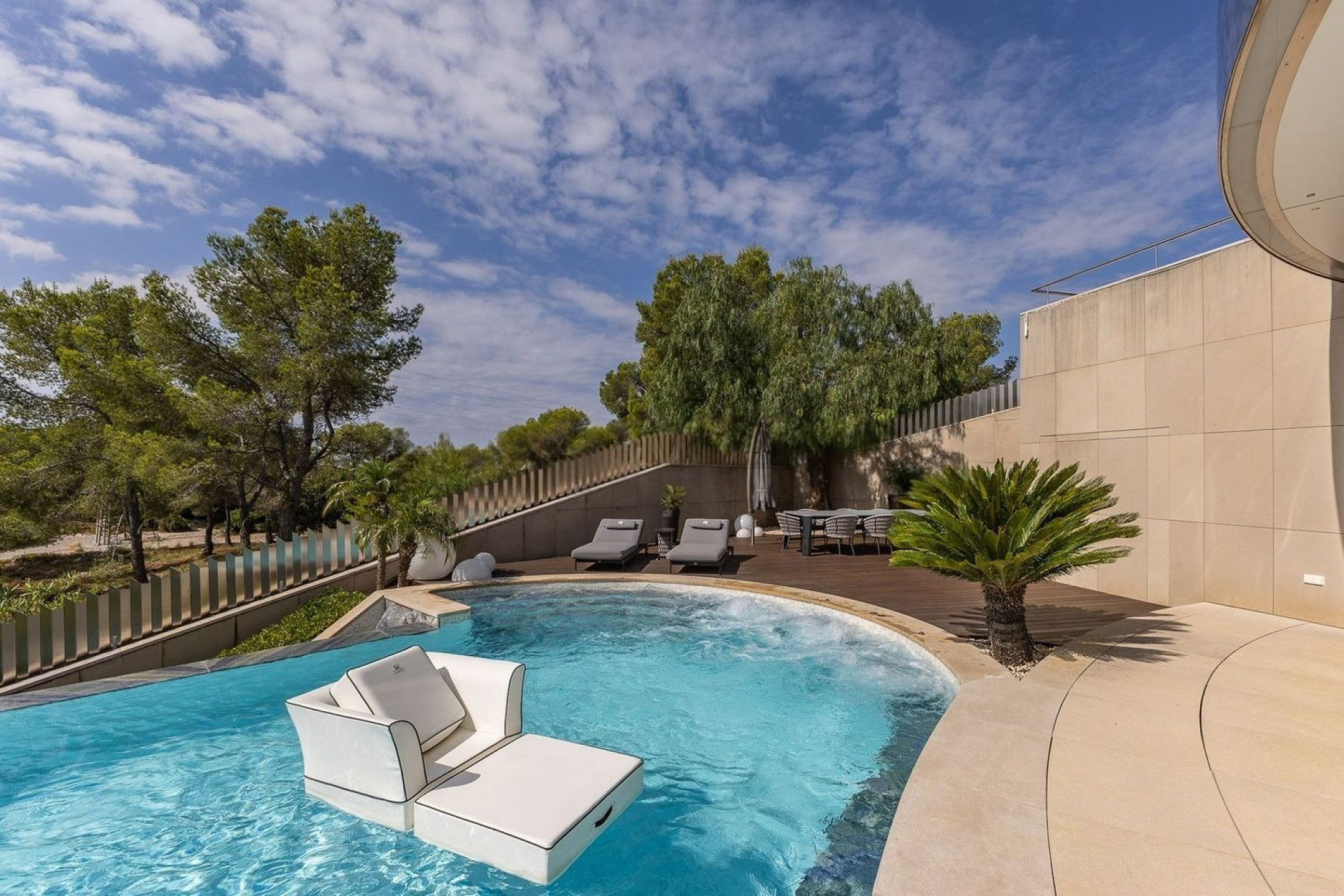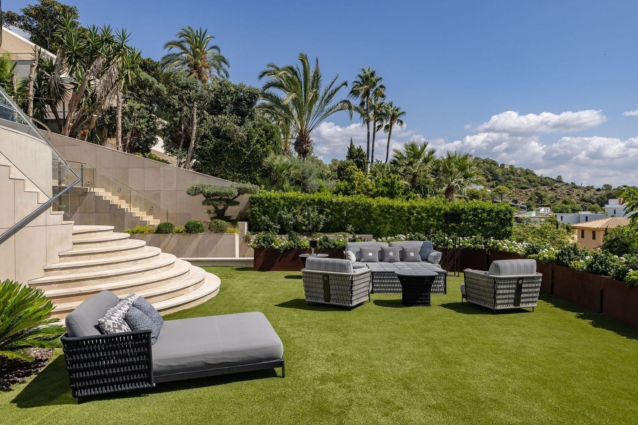 В доме пять спален и пять ванных комнат, четыре из которых en suite, а также отдельные апартаменты для гостей, обеспечивающие дополнительную приватность и удобство.