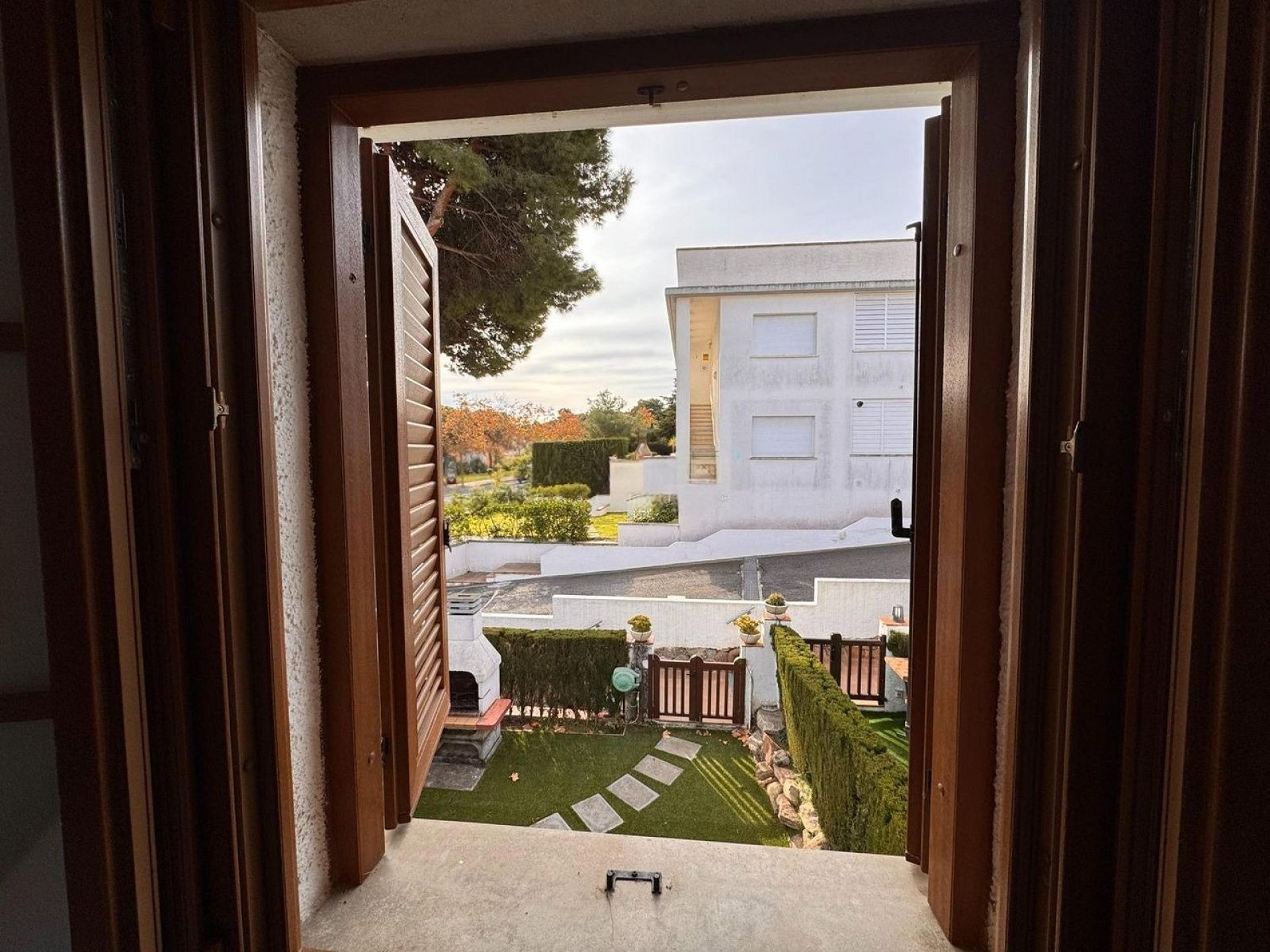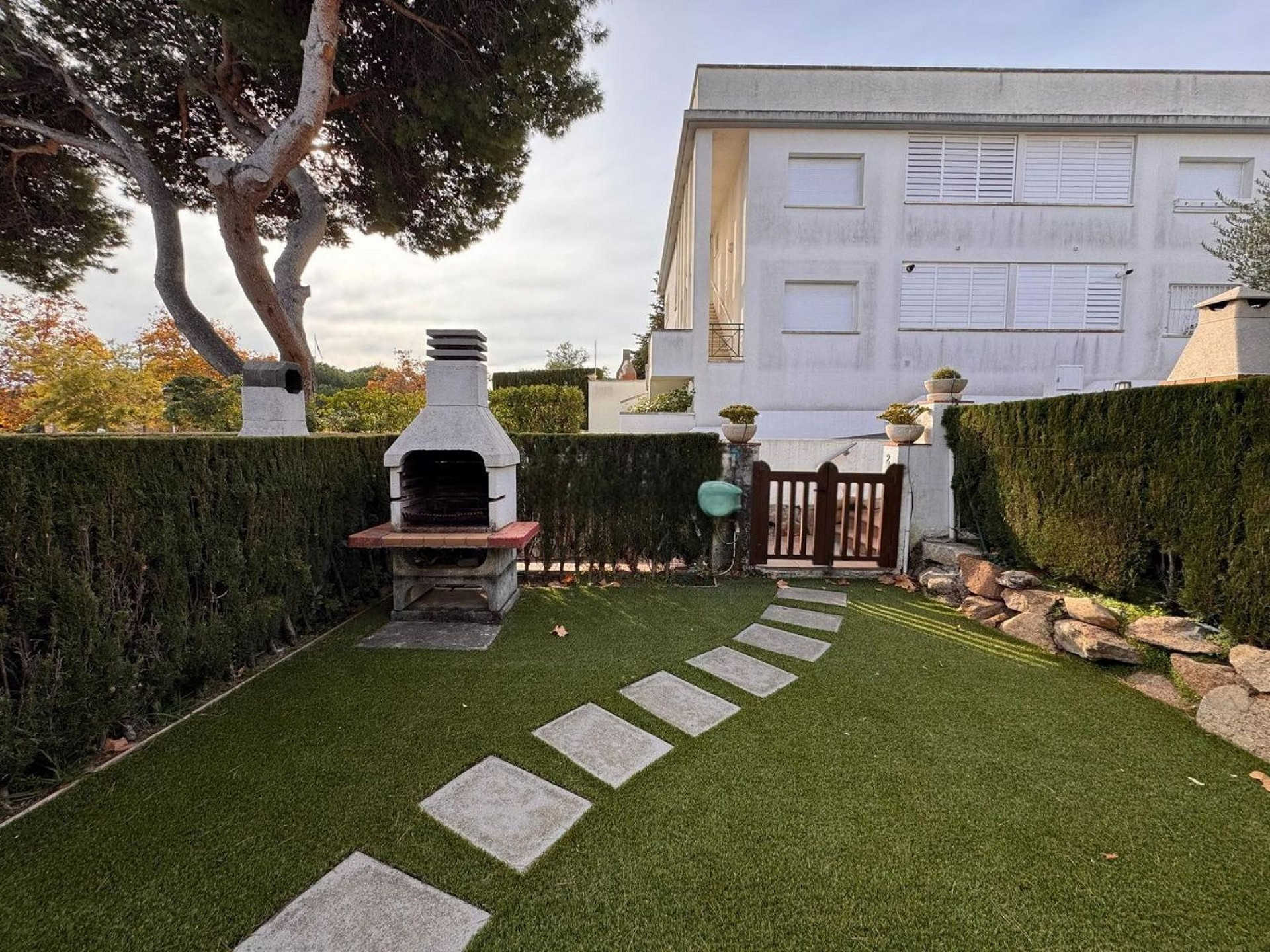 На первом этаже расположен уютный гостиный-обеденный зал с открытой кухней, с прямым выходом во двор. Здесь находится частный внутренний дворик с барбекю и садовой зоной, идеально подходящий для отдыха на свежем воздухе. Также имеется передний сад, обеспечивающий дополнительную приватность.