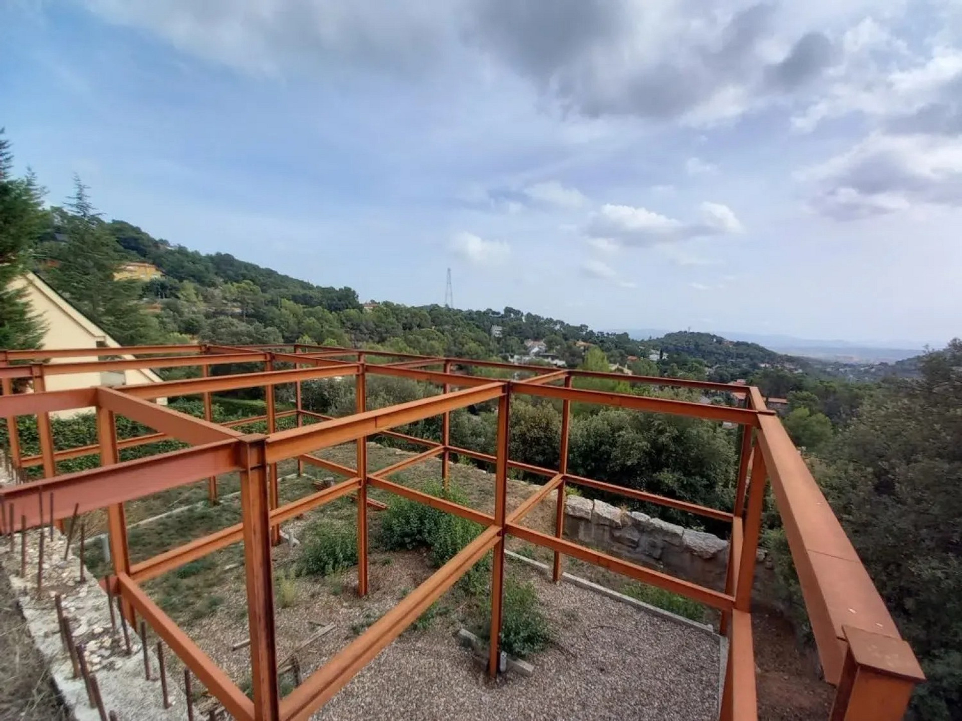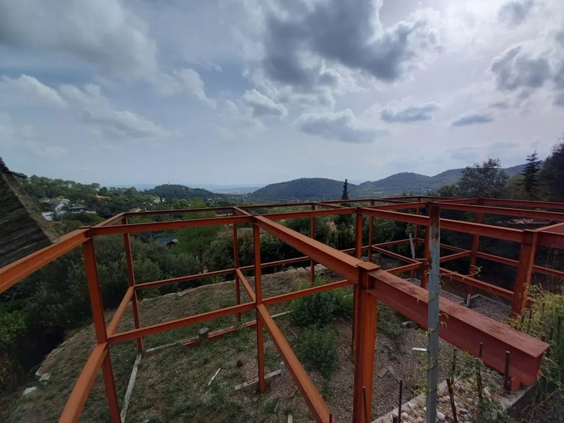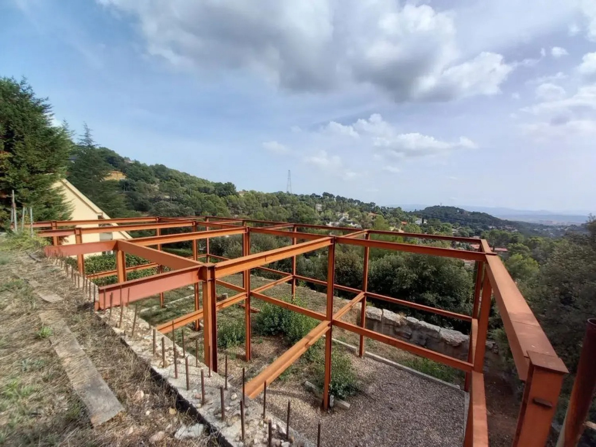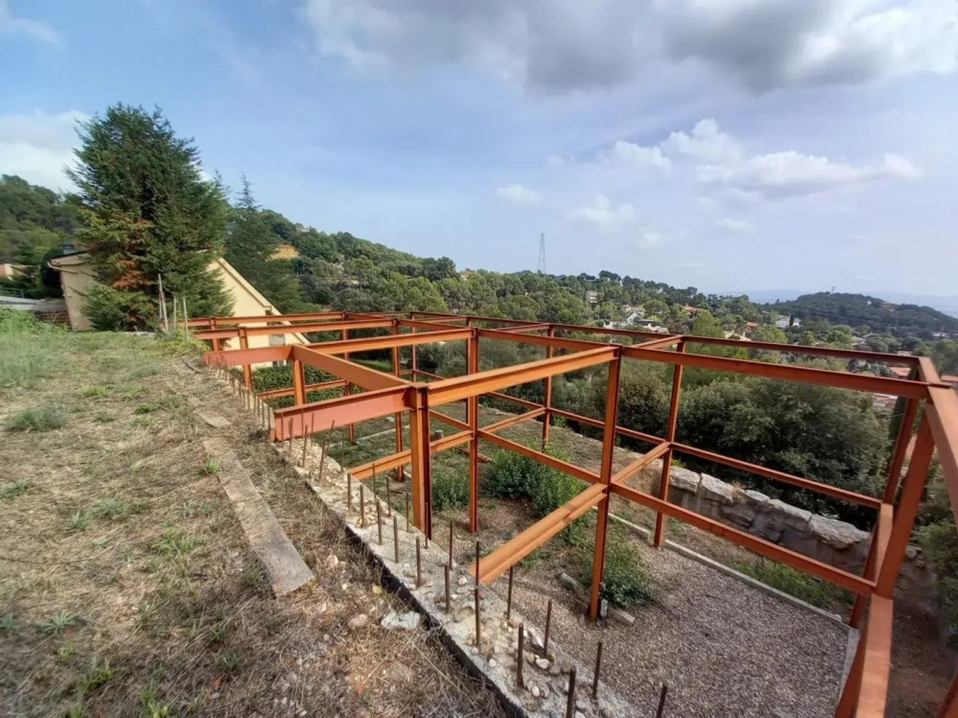 Участок площадью 900 м² с уклоном и прекрасным панорамным видом. На территории уже выполнены земляные работы и возведена металлическая конструкция с бетонной стеной, готовая для продолжения строительства дома.