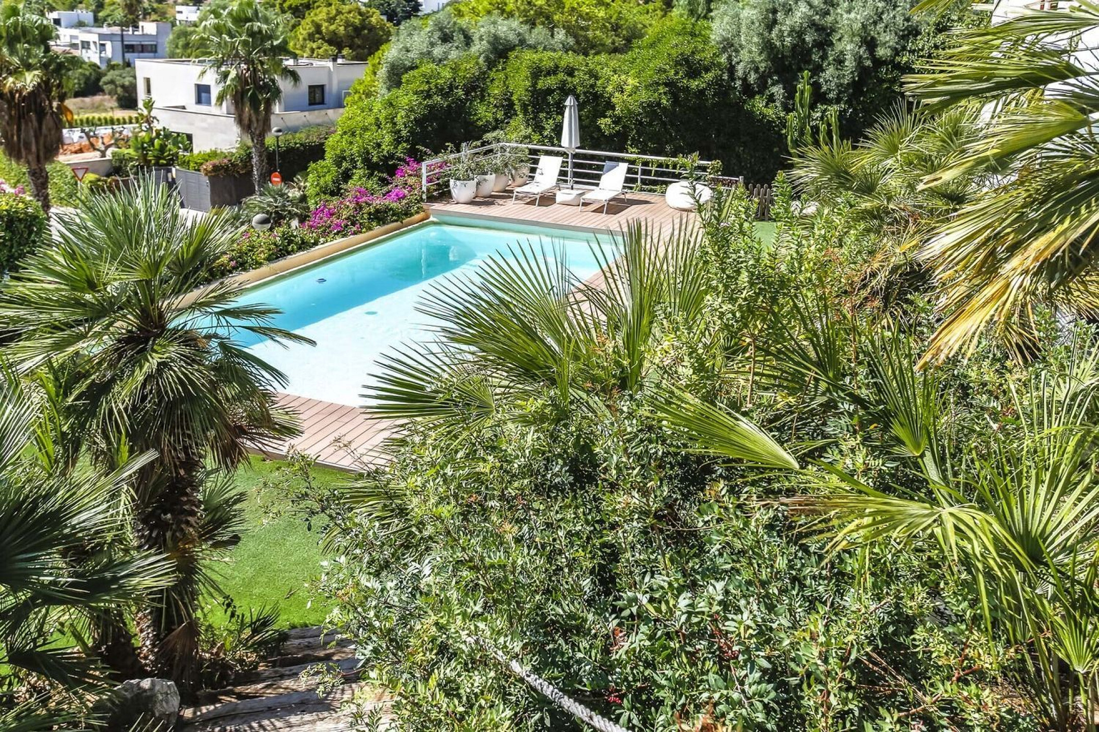 Сад включает бассейн, зону барбекю с обеденной зоной на открытом воздухе, зоны отдыха и отдельную гостевую спальню. Предусмотрено парковочное пространство для нескольких автомобилей.