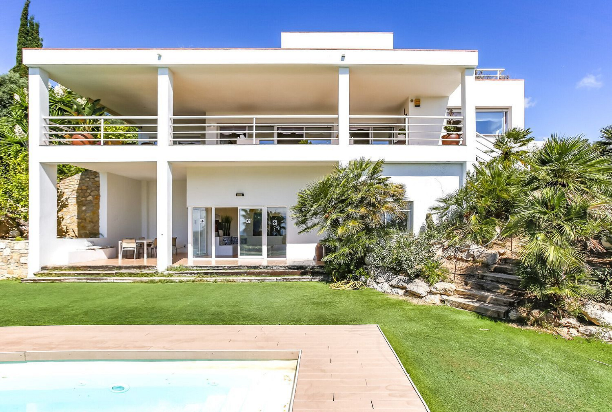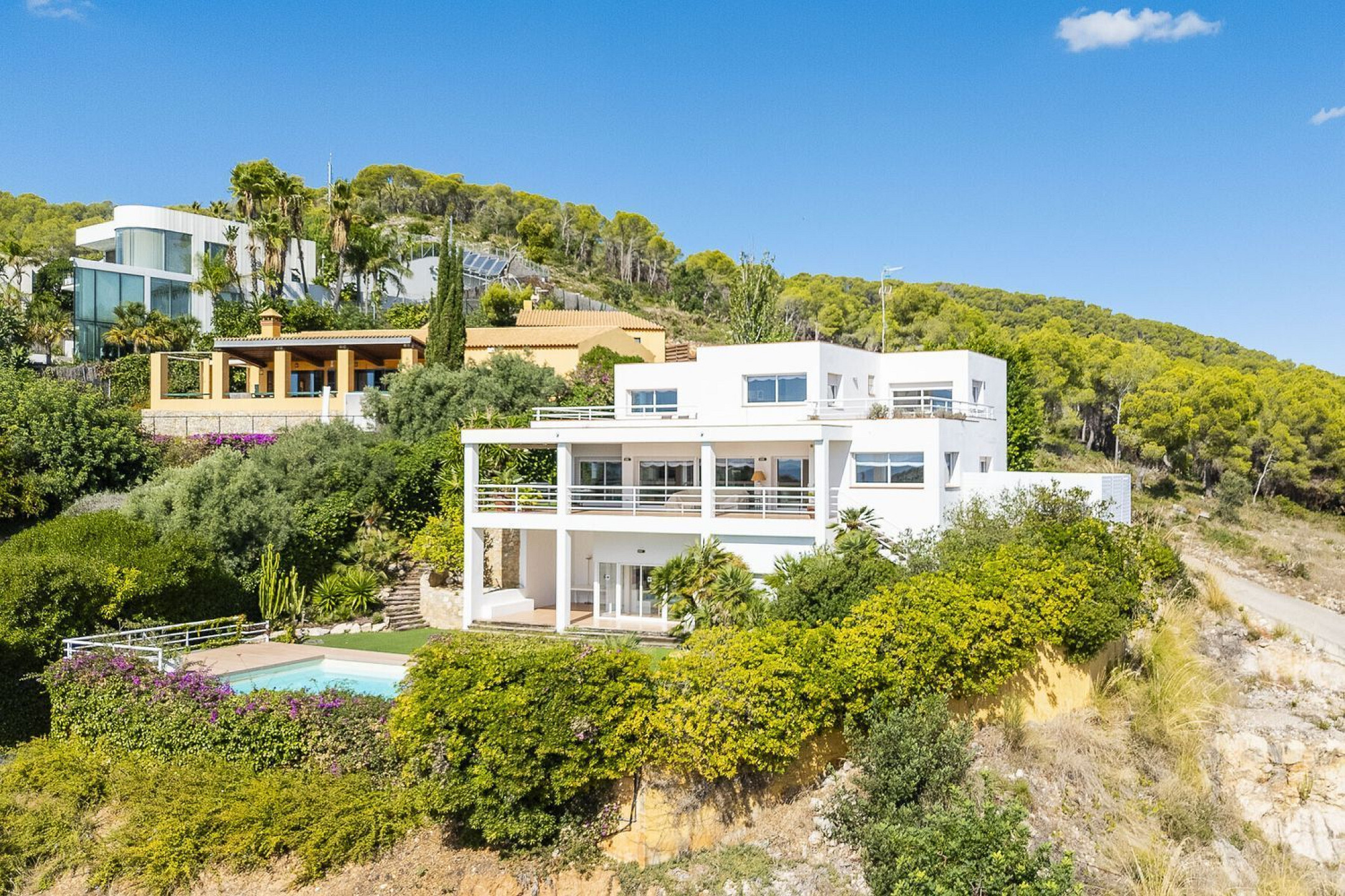 На верхнем уровне находятся три дополнительные спальни с ванными комнатами, отличным естественным освещением и видами на море, а также две просторные террасы.