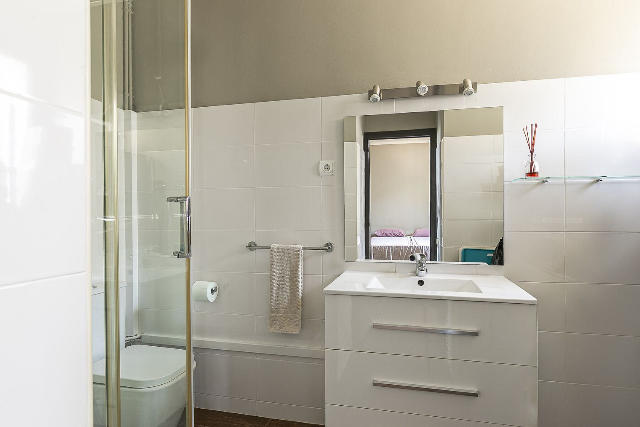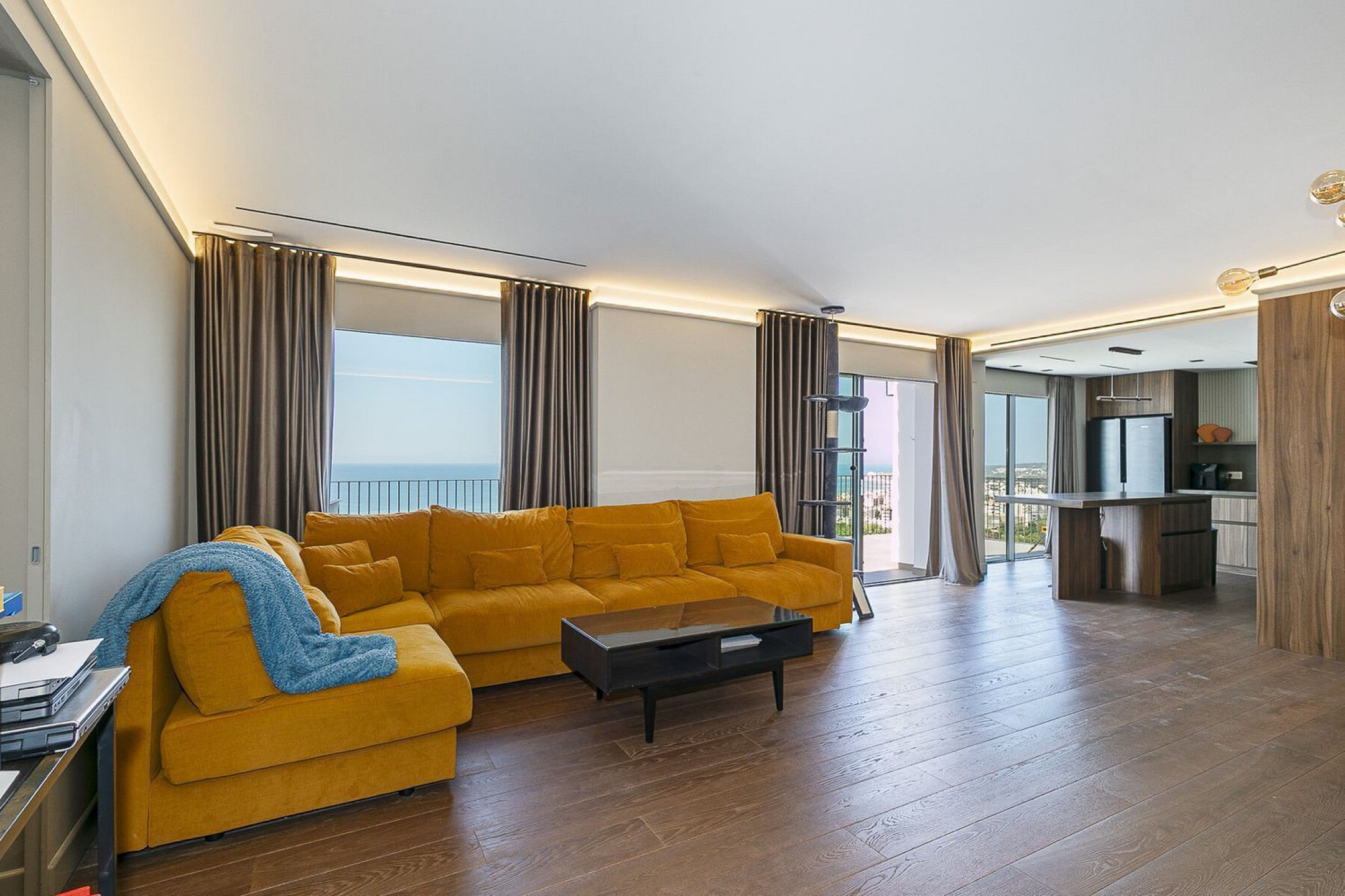 Средний уровень включает просторную гостиную с обеденной зоной в формате open space, объединённую с современной полностью оборудованной кухней. С этого уровня открывается выход на просторную южную террасу с панорамным видом на Средиземное море. На этом этаже также расположены три светлые спальни и две элегантные ванные комнаты.